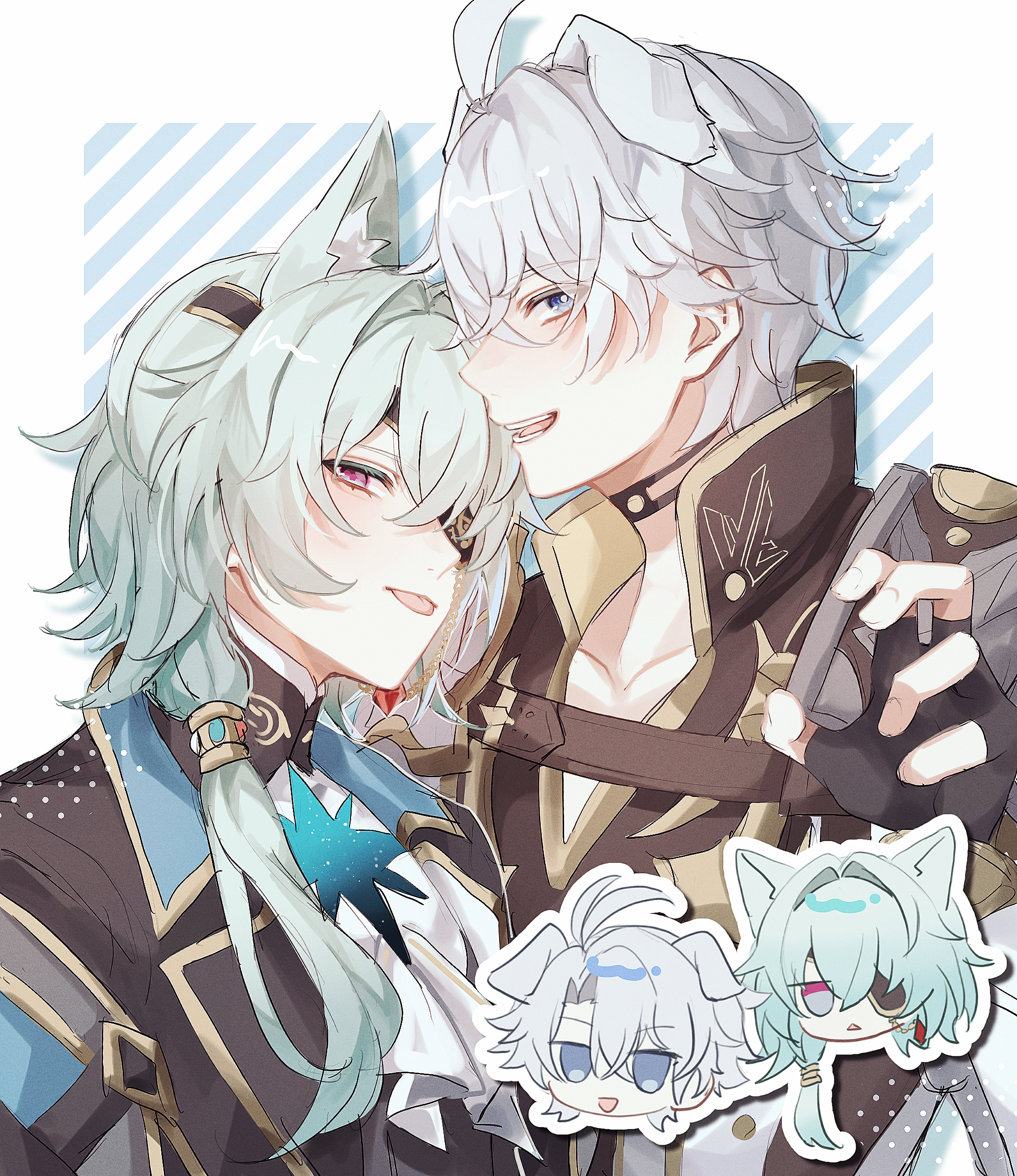 2boys anaxa_(honkai:_star_rail) aqua_hair cat_boy chibi dog_boy earrings eyepatch fz7047 grey_hair hair_between_eyes highres honkai:_star_rail honkai_(series) jewelry looking_at_viewer male_focus multiple_boys one_eye_covered open_mouth phainon_(honkai:_star_rail) pink_pupils short_hair single_earring striped_background tongue tongue_out upper_body