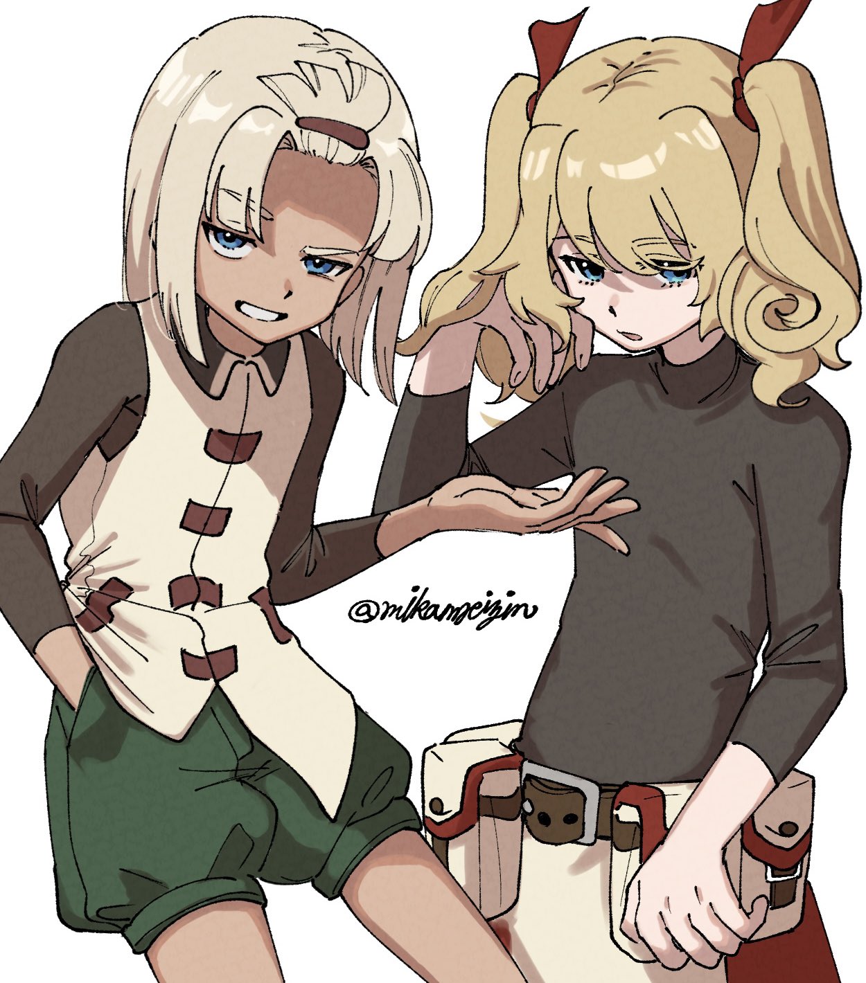 2boys belt belt_pouch black_shirt blonde_hair blue_eyes cowboy_shot etrian_odyssey fortress_(sekaiju) fortress_2_(sekaiju) genderswap genderswap_(ftm) green_shorts grin hand_in_pocket highres long_sleeves mikamseizin multiple_boys pouch sekaiju_no_meikyuu sekaiju_no_meikyuu_4 shirt shorts smile sniper_(sekaiju) sniper_4_(sekaiju) twintails vest white_vest
