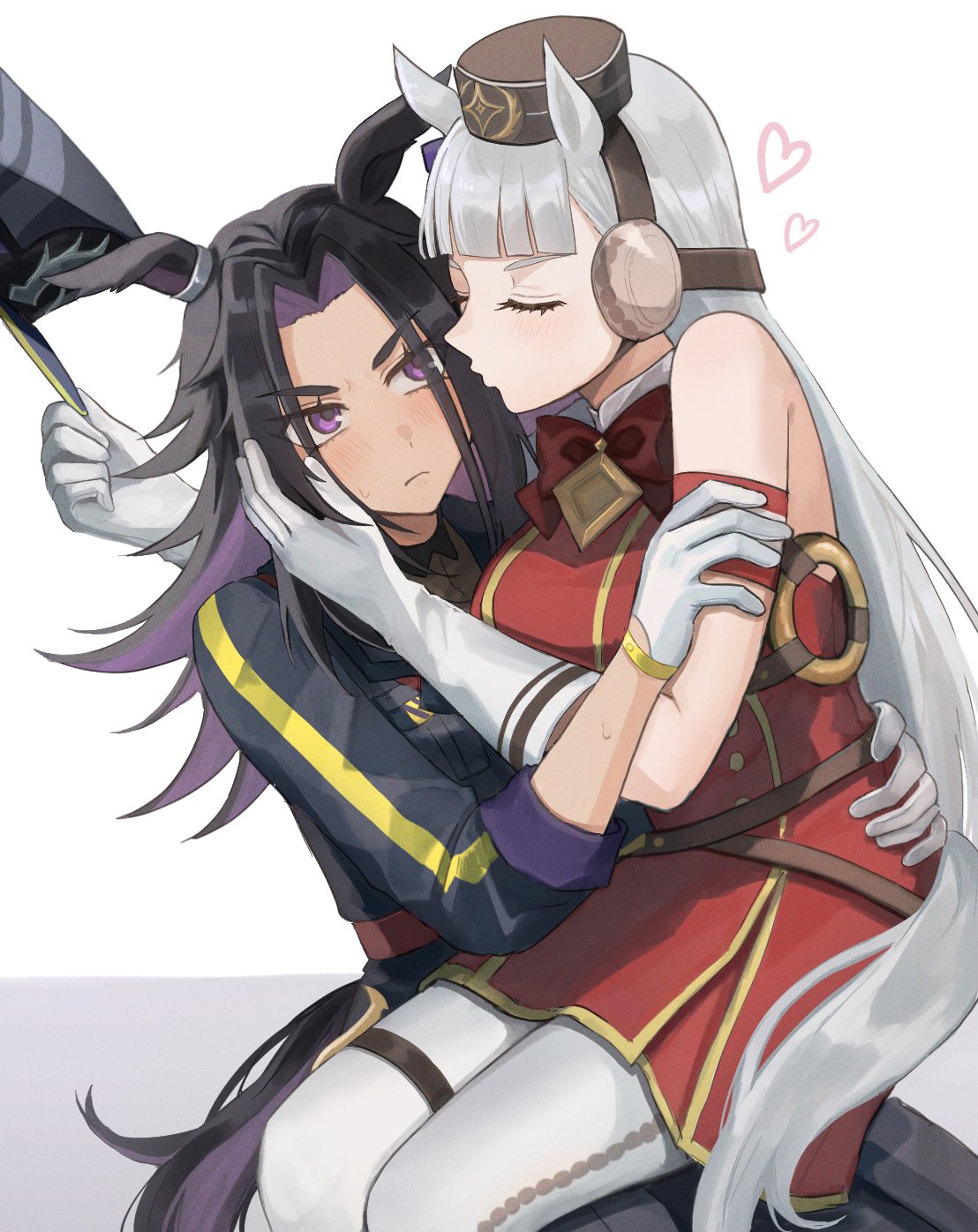 2girls animal_ears armband bare_shoulders black_hair black_jacket blunt_bangs blush bow breasts brown_hat closed_eyes closed_mouth ear_bow ear_covers ear_ribbon fenomeno_(umamusume) flipped_hair gloves gold_ship_(umamusume) grey_hair hat heart highres himo_(user_rzgz5877) horse_ears horse_girl horse_tail imminent_kiss jacket kiss large_breasts long_hair long_sleeves multicolored_hair multiple_girls pants pantyhose peaked_cap pillbox_hat puckered_lips purple_bow purple_eyes purple_hair red_armband shirt simple_background sitting sitting_on_lap sitting_on_person tail thigh_strap umamusume unworn_hat unworn_headwear white_gloves white_hair white_pantyhose yuri