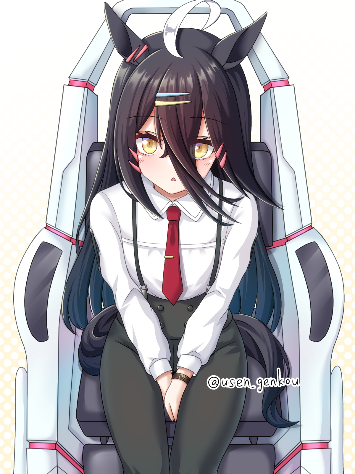 1girl ahoge animal_ears black_hair black_pants collared_shirt commentary_request cosplay hair_between_eyes hair_ornament hairclip high-waist_pants highres horse_ears horse_girl horse_tail long_hair long_hair_between_eyes long_sleeves manhattan_cafe_(umamusume) necktie open_mouth pants red_necktie shirt sitting solo sugar_lights_(umamusume) sugar_lights_(umamusume)_(cosplay) suspenders tail twitter_username umamusume white_shirt yellow_eyes yuusen_(aenka)