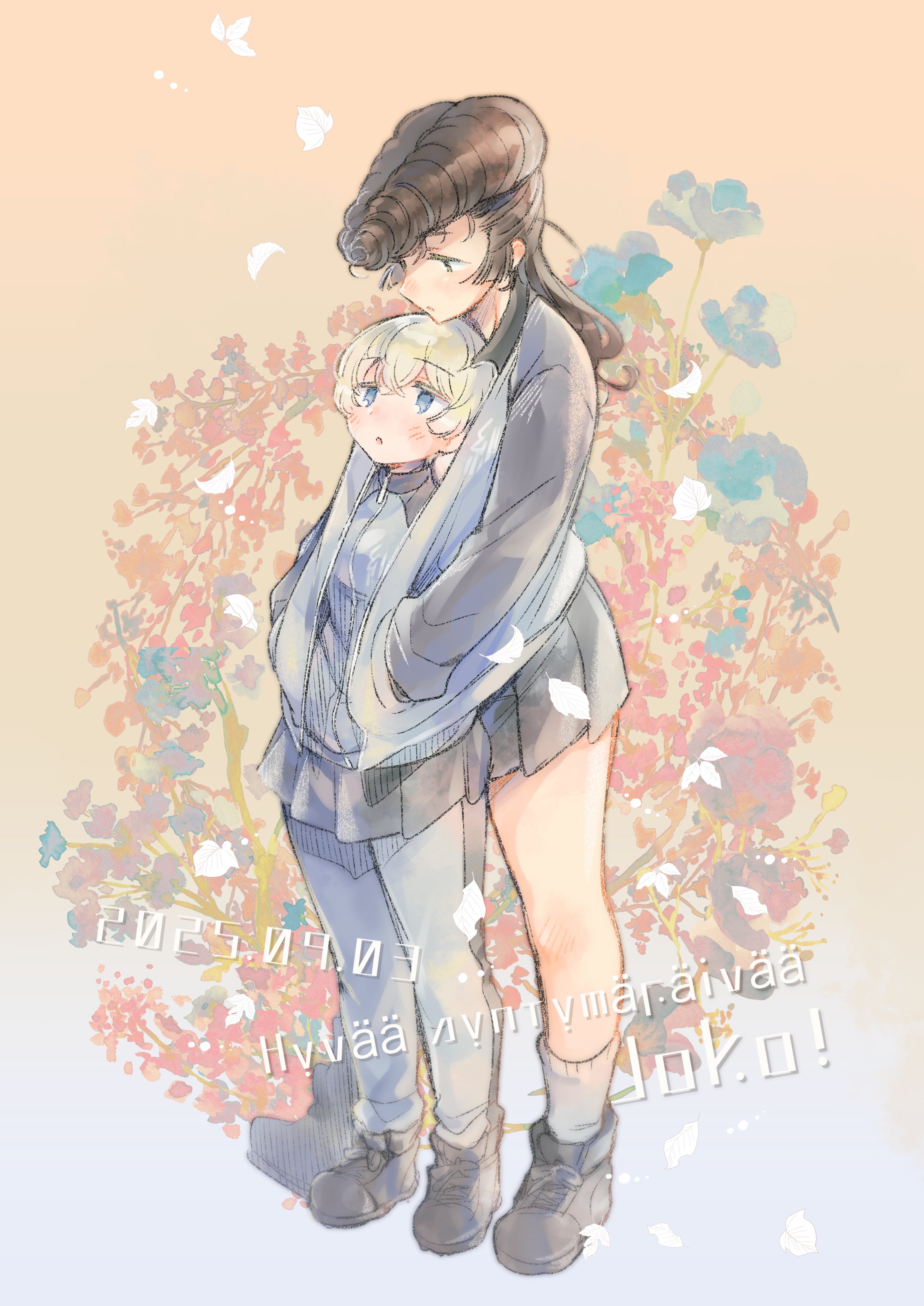2girls :o absurdres black_jacket black_skirt blonde_hair blue_eyes brown_hair falling_petals full_body girls_und_panzer highres jacket keizoku_school_uniform koyama_harutarou looking_at_another multiple_girls petals pompadour school_uniform shoes short_hair size_difference skirt socks standing youko_(girls_und_panzer) yuri yuri_(girls_und_panzer)