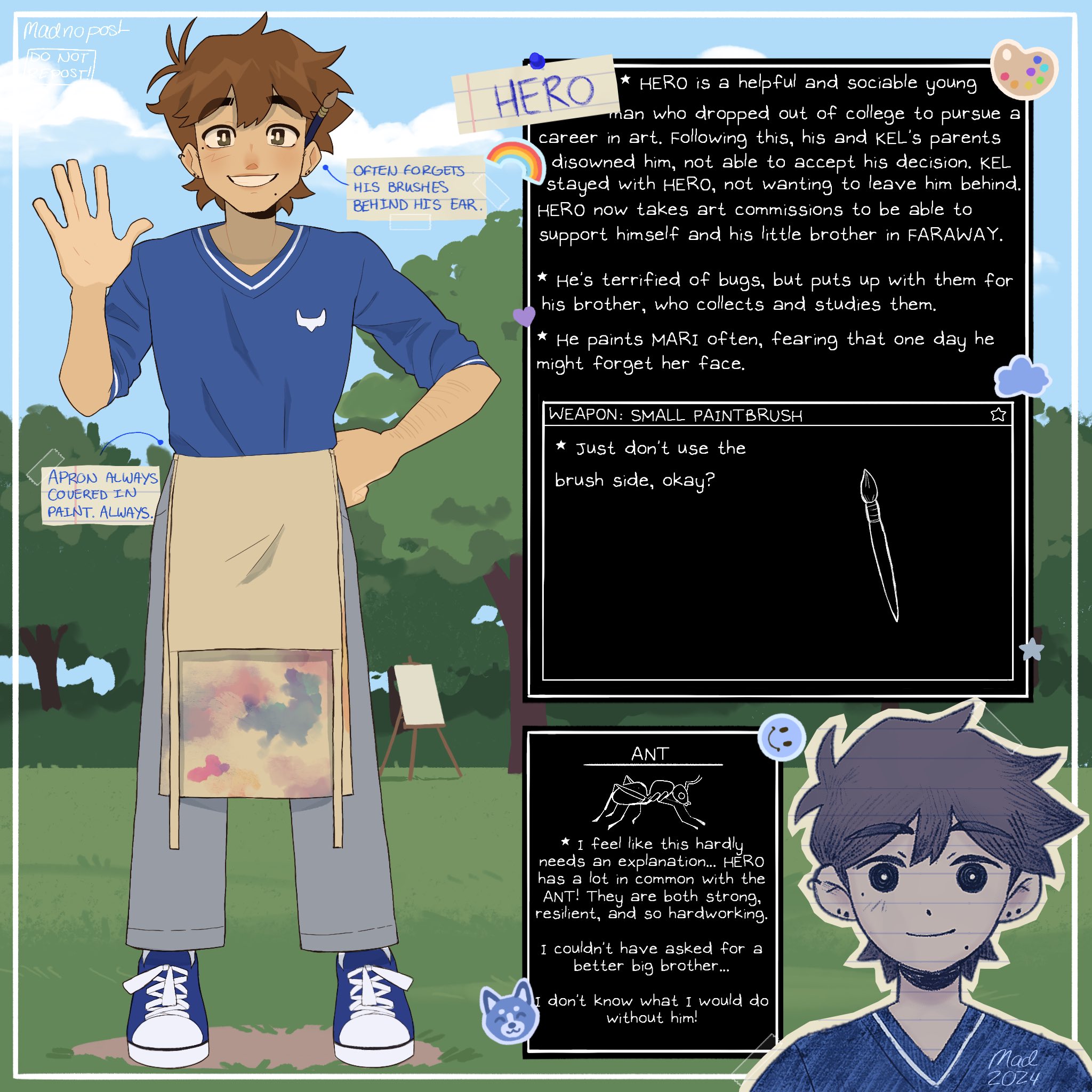 1boy 2024 alternate_costume alternate_universe antenna_hair apron artist_name blue_shoes blue_sky bright_pupils brown_eyes brown_hair character_name cloud dark-skinned_male dark_skin day double-parted_bangs ear_piercing easel english_text full_body grey_pants grin hero_(faraway)_(omori) hero_(omori) highres looking_at_viewer madnopost male_focus mole mole_under_eye mole_under_mouth omocat_(style) omori open_mouth outdoors paintbrush pants piercing shoes short_hair short_sleeves sky sleeves_rolled_up smile sneakers solo teeth tree white_apron white_pupils
