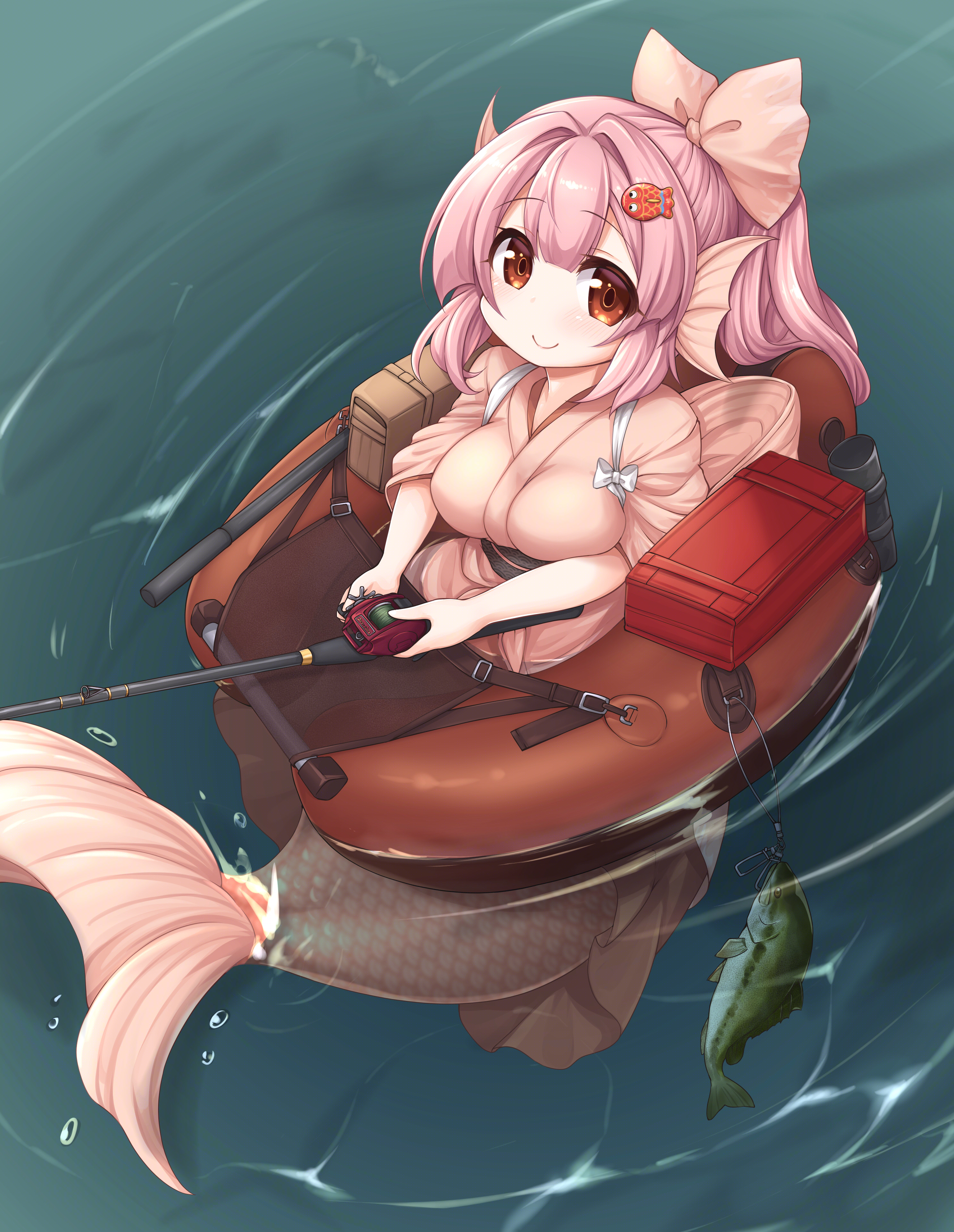 1girl absurdres afloat bag blunt_bangs bow breasts closed_mouth commentary_request fins fish fish_hair_ornament fishing fishing_rod full_body hair_between_eyes hair_bow hair_ornament head_fins highres holding holding_fishing_rod japanese_clothes kimono kinomiki_nobori kneeless_merfolk large_breasts long_hair looking_at_viewer mermaid monster_girl original pink_bow pink_kimono red_eyes sidelocks smile solo water
