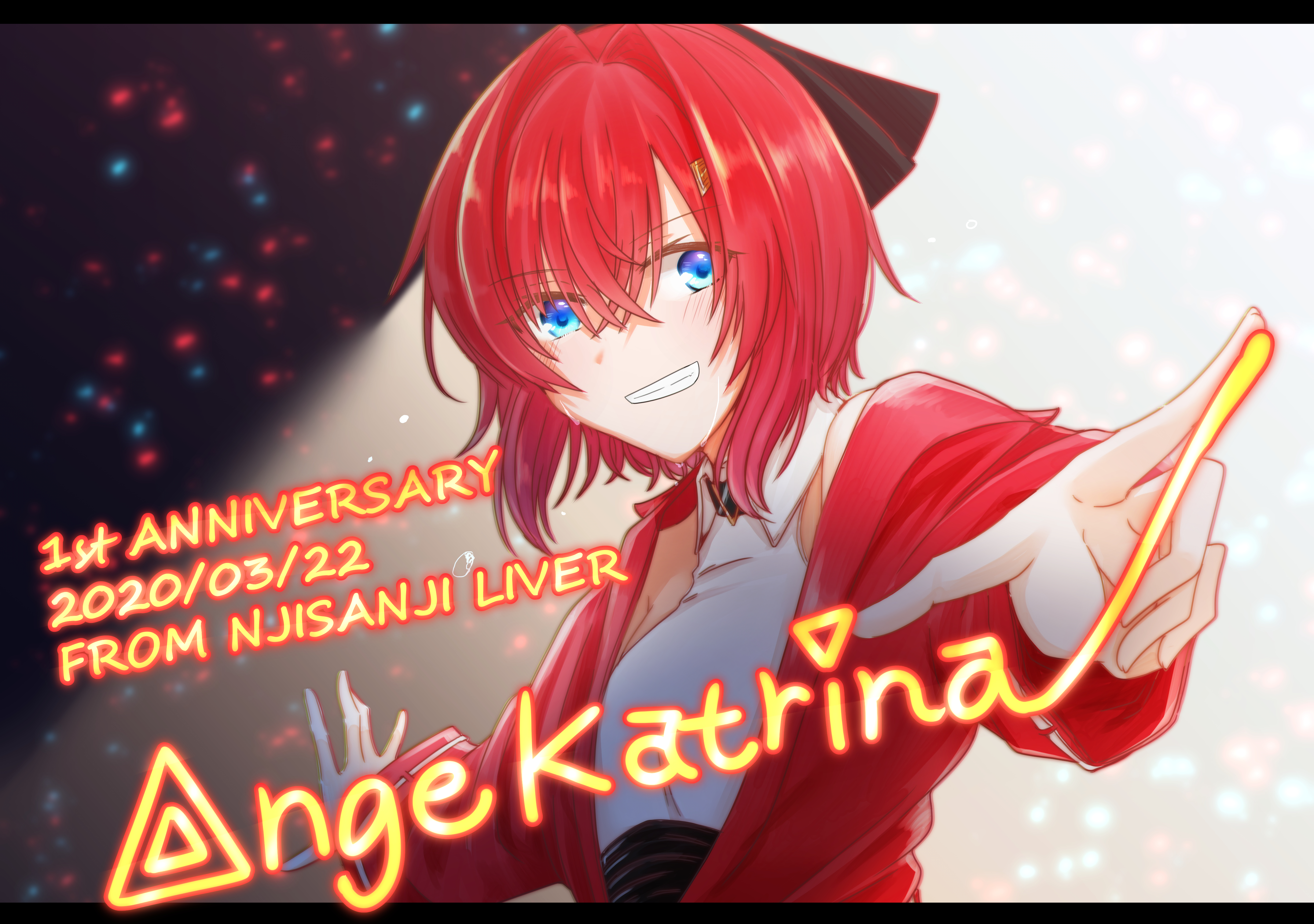 absurdres ange_katrina ange_katrina_(summer_casual) anniversary black_bow blue_eyes blush bow breasts character_name collared_shirt commentary_request copyright_name crossed_bangs dated drawing_on_fourth_wall english_text finger_writing grin hair_bow hair_intakes halter_shirt halterneck highres jacket letterboxed long_bangs long_sleeves looking_at_viewer medium_hair nijisanji open_clothes open_jacket outstretched_arms pointing pokkii_(orikaden01) red_hair red_jacket shirt shirt_tucked_in small_breasts smile sweat virtual_youtuber white_shirt