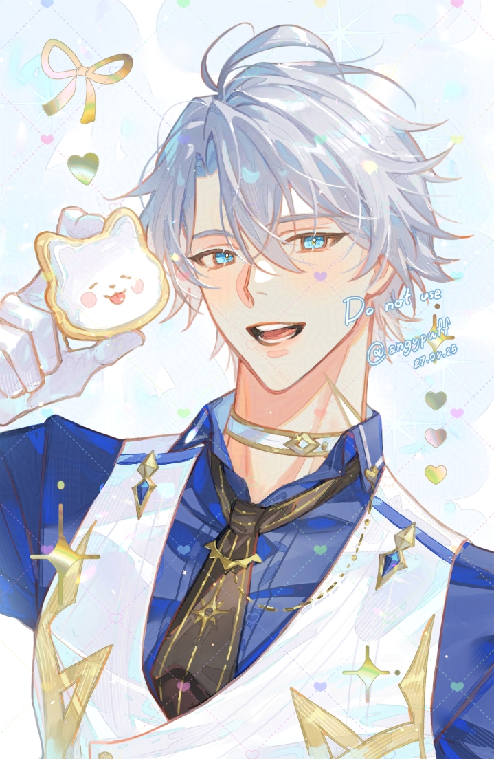 1boy alternate_costume angypuff antenna_hair artist_name black_necktie blue_eyes blue_shirt choker collared_shirt cookie dated food gloves gold_trim grey_hair hair_between_eyes hand_up heart holding holding_food honkai:_star_rail honkai_(series) long_sleeves looking_at_viewer male_focus necktie open_mouth phainon_(honkai:_star_rail) ribbon shirt short_hair simple_background smile solo sparkle teeth tongue upper_body vest white_background white_choker white_gloves white_vest yellow_ribbon