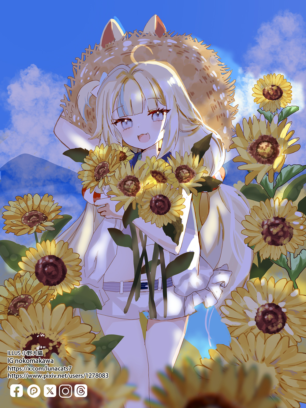 1girl :d ahoge animal_ears arm_behind_head arm_up belt belt_buckle blonde_hair blue_belt blue_eyes blue_hair blue_sailor_collar blue_sky blush buckle cat_ears cloud commentary day dress ears_through_headwear english_commentary fang flower hat highres hugging_object indie_virtual_youtuber instagram_logo long_hair looking_at_viewer lunacats mountain multicolored_hair navel one_side_up open_mouth outdoors pixiv_logo sailor_collar sameko_saba short_shorts shorts sky sleeveless sleeveless_dress smile solo straw_hat streaked_hair sunflower twitter_x_logo very_long_hair virtual_youtuber watermark web_address white_dress white_shorts yellow_flower