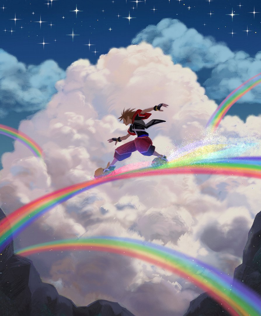 1boy balancing black_gloves black_jacket black_shirt brown_hair cloud commentary english_commentary fingerless_gloves from_side full_body gloves hood hooded_jacket jacket kingdom_hearts kingdom_hearts_3d:_dream_drop_distance male_focus mimamilux night open_clothes open_jacket outdoors outstretched_arms pants puffy_pants rainbow red_pants rock shirt shoes short_hair short_sleeves sky solo sora_(kingdom_hearts) sparkle spiked_hair star_(sky) yellow_shoes