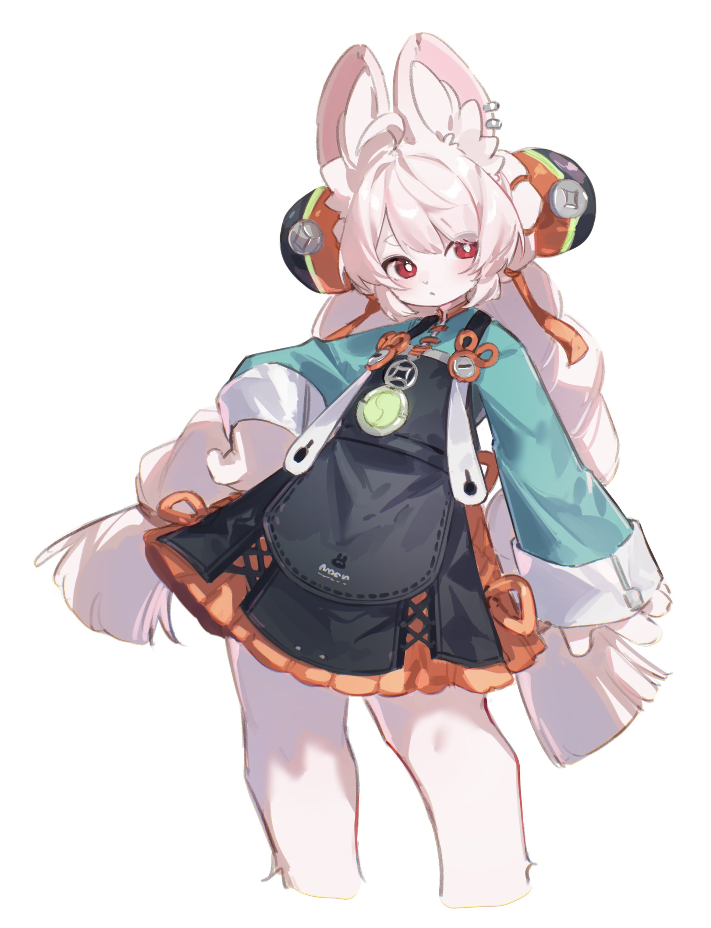 1girl absurdres accessories animal_ear_fluff animal_ears black_dress bright_pupils dress ear_piercing furry furry_female green_shirt hair_ornament highres kawarage_yatano long_hair looking_to_the_side medallion piercing pink_hair rabbit_ears rabbit_girl red_dress red_eyes screw shirt solo thick_eyebrows twintails white_background white_fur white_pupils zenless_zone_zero zhao_(zenless_zone_zero)