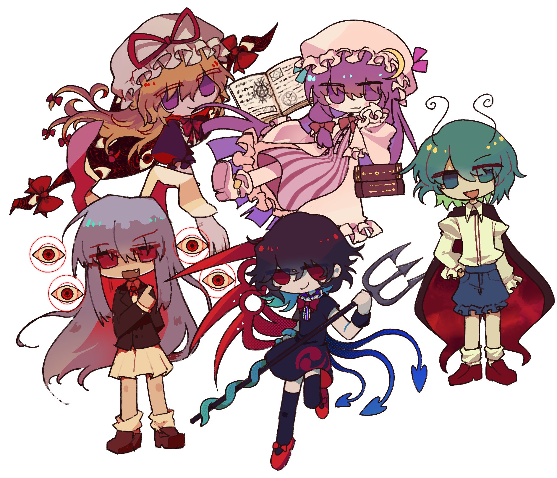 5girls animal_ears antennae asymmetrical_wings black_cape black_dress black_suit black_thighhighs blonde_hair blue_ribbon blue_shorts book boots bow bowtie brown_shoes cape capelet collared_shirt commentary crescent crescent_hat_ornament dress english_commentary fang formal_clothes frilled_shirt frilled_shorts frills gap_(touhou) green_hair hair_bow hand_on_own_cheek hand_on_own_face hat hat_ornament highres holding holding_polearm holding_weapon houjuu_nue jacket leg_up long_hair mob_cap multicolored_hair multiple_girls open_clothes open_jacket open_mouth patchouli_knowledge pink_boots pink_hat pink_ribbon pleated_skirt polearm purple_dress purple_eyes purple_hair purple_tabard rabbit_ears red_bow red_bowtie red_cape red_eyes red_ribbon red_sandals red_shoes reisen_udongein_inaba ribbon sandals shirt shoes short_hair shorts simple_background skirt smile socks standing striped_clothes striped_dress suit tabard thighhighs touhou trident two-sided_cape two-sided_fabric two-tone_hair vertical-striped_clothes vertical-striped_dress very_long_hair vyrasyte weapon white_background white_capelet white_hat white_jacket white_shirt white_skirt white_socks wings wriggle_nightbug yakumo_yukari