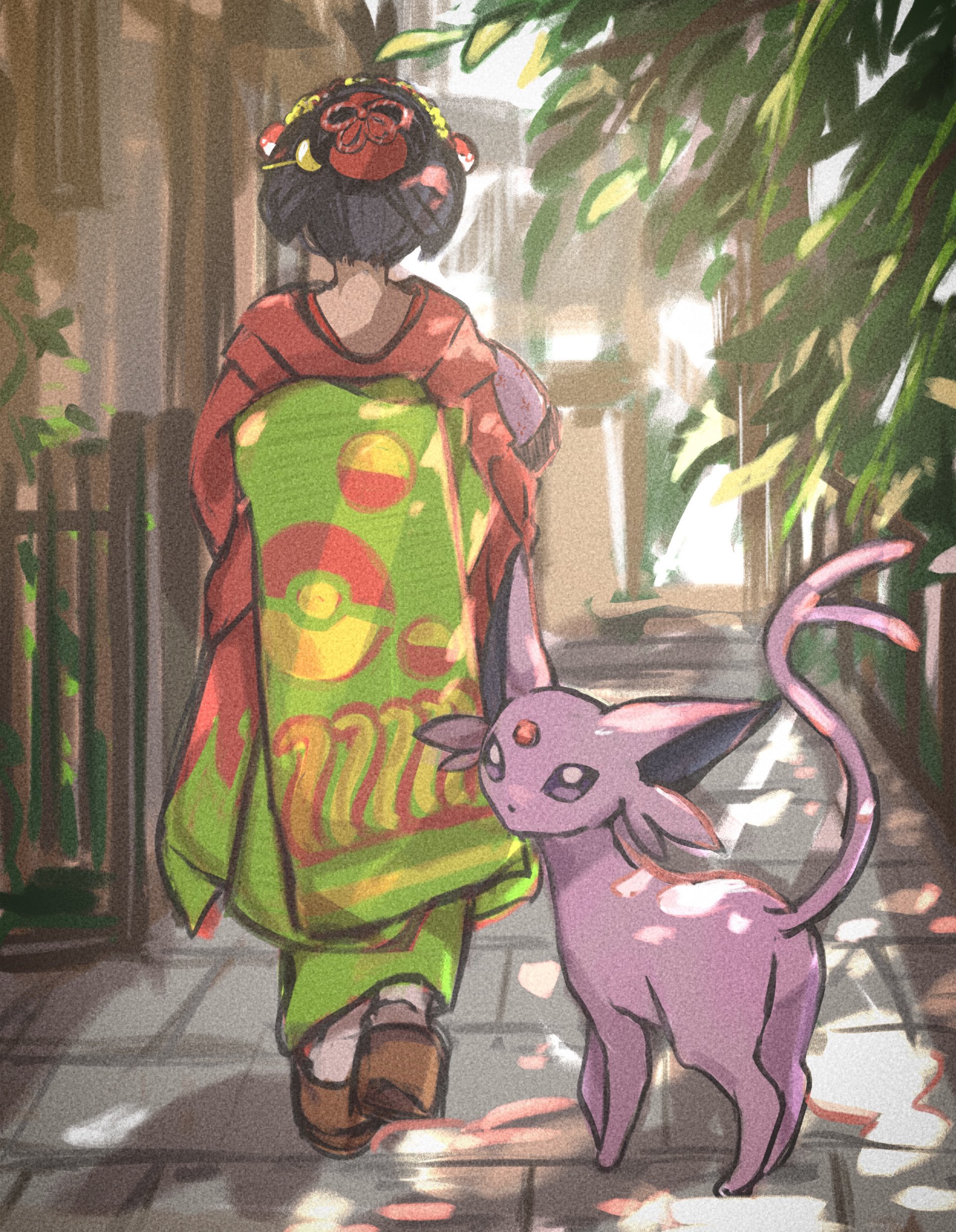 1girl absurdres anzu_(01010611) black_hair brown_sandals commentary_request day espeon fence from_behind gen_2_pokemon hair_ornament highres japanese_clothes kimono kimono_girl_(pokemon) nintendo outdoors poke_ball_print pokemon pokemon_(creature) pokemon_heartgold_and_soulsilver sandals shadow short_hair socks standing white_socks