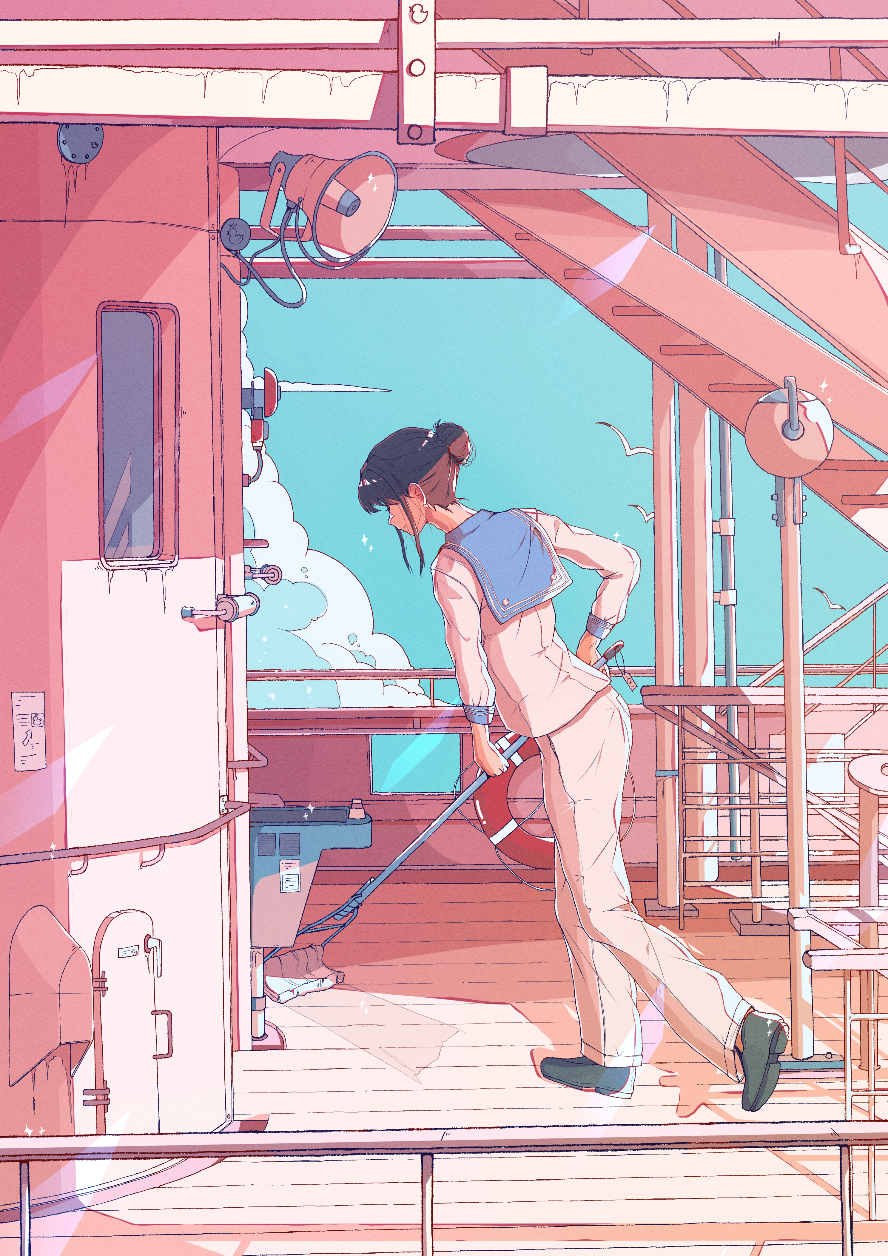 1girl absurdres blue_sailor_collar blue_sky boat brown_hair cleaning commentary_request day from_side full_body grey_shoes hair_bun highres holding holding_mop lifebuoy long_sleeves mop on_boat original outdoors pants sailor sailor_collar shirt shoes sidelocks simple_bird single_hair_bun sky solo speaker swim_ring walking watercraft white_pants white_shirt yasi_irasuto