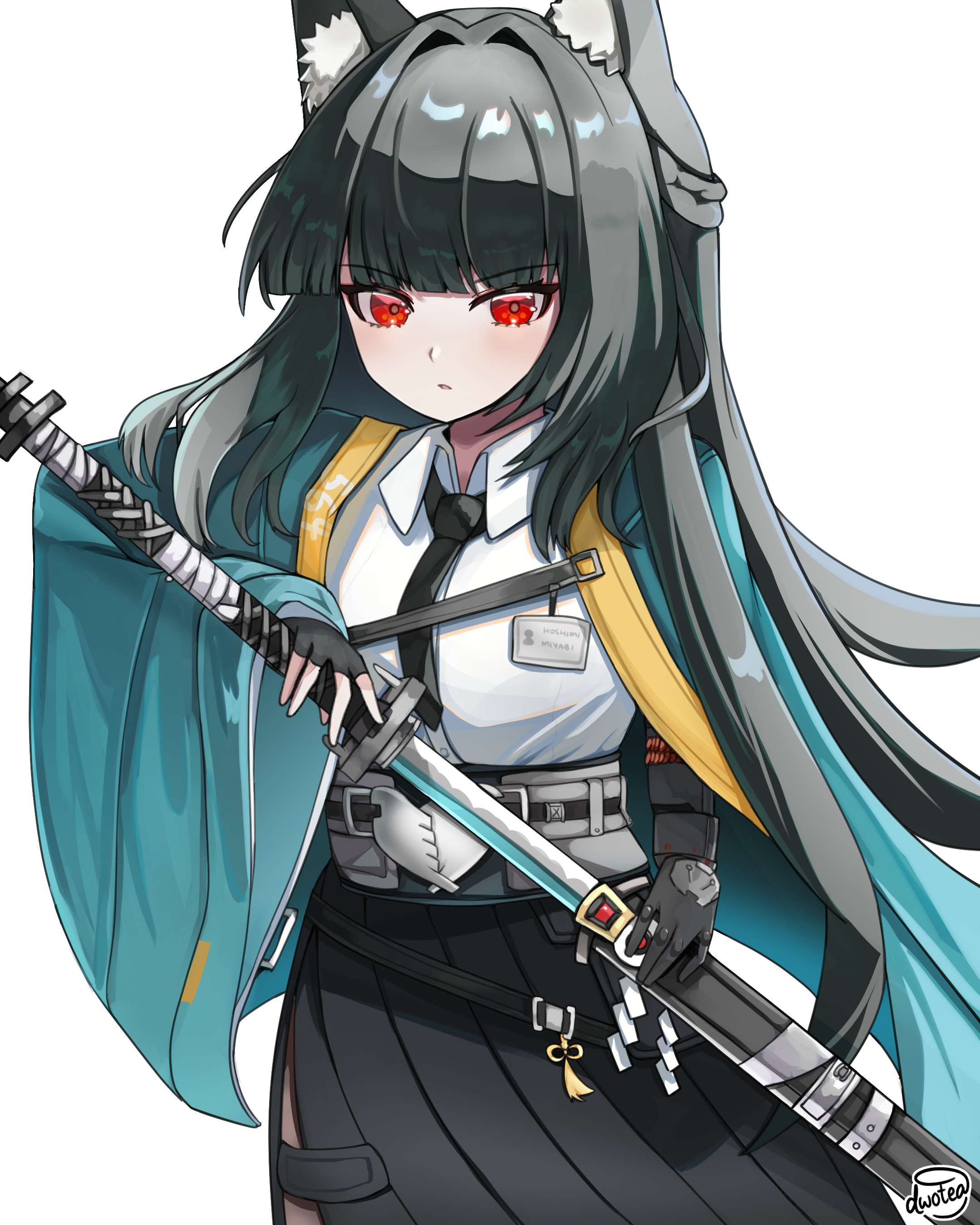 1girl absurdres animal_ear_fluff animal_ears aqua_jacket black_hair blunt_bangs breasts dwotea fox_ears fox_girl gloves highres hoshimi_miyabi jacket long_hair necktie pantyhose red_eyes shirt sidelocks skirt weapon white_shirt zenless_zone_zero