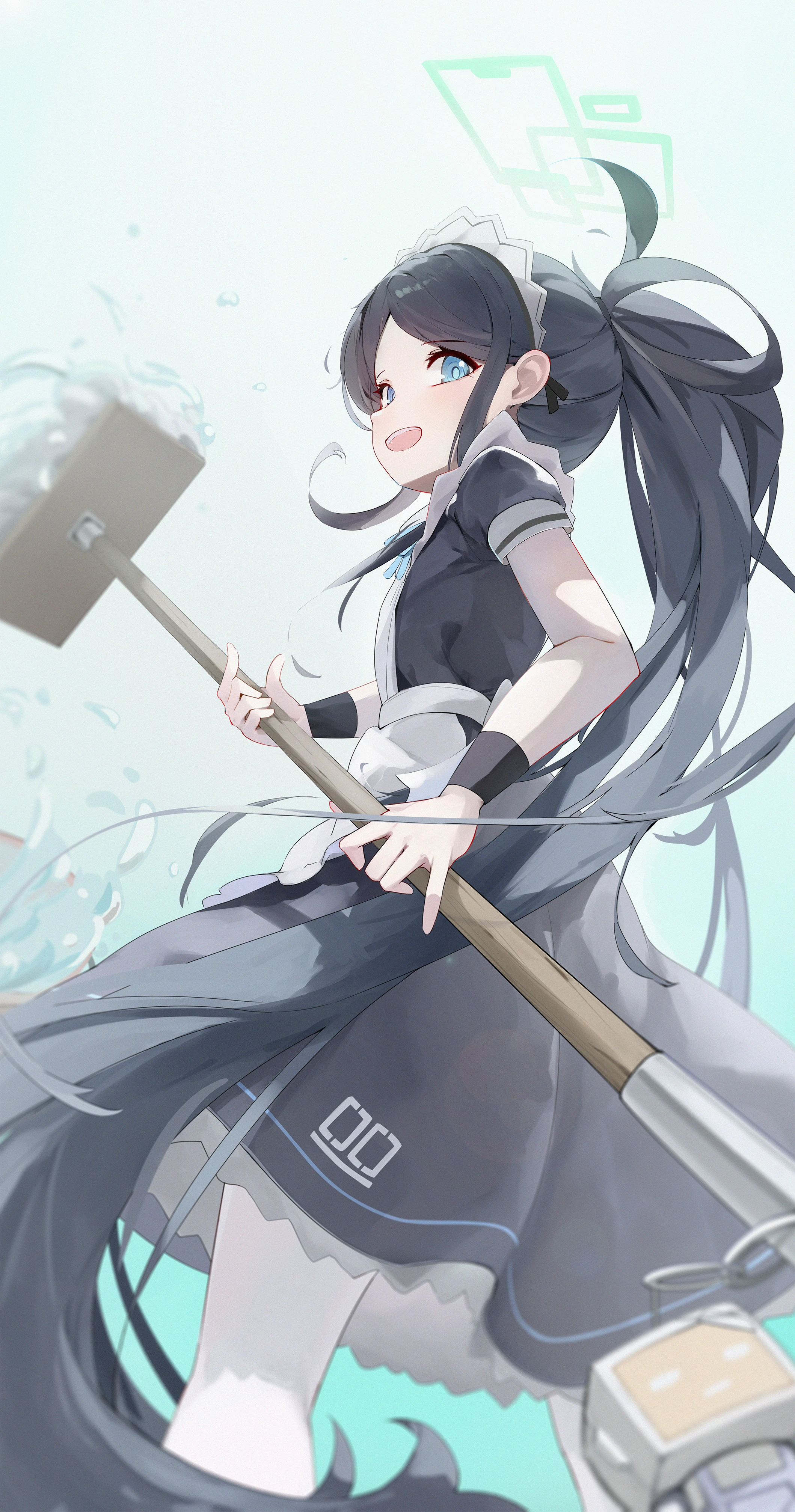 1girl absurdly_long_hair absurdres apron aqua_background aqua_eyes aqua_halo aqua_ribbon aris_(blue_archive) aris_(maid)_(blue_archive) black_dress black_hair black_wrist_cuffs blue_archive blurry bright_pupils bucket chinese_commentary commentary depth_of_field dress feet_out_of_frame floating_hair frilled_apron frilled_dress frills halo highres holding holding_mop kei_(robot)_(blue_archive) long_hair looking_at_viewer looking_to_the_side maid maid_apron maid_headdress making-of_available mi_kan_(1101515378) mop neck_ribbon number_print official_alternate_costume official_alternate_hairstyle open_mouth painttool_sai_(medium) pantyhose parted_bangs ponytail profile rectangular_halo ribbon short_sleeves sidelocks smile solo teeth upper_teeth_only very_long_hair water white_apron white_headdress white_pantyhose wrist_cuffs