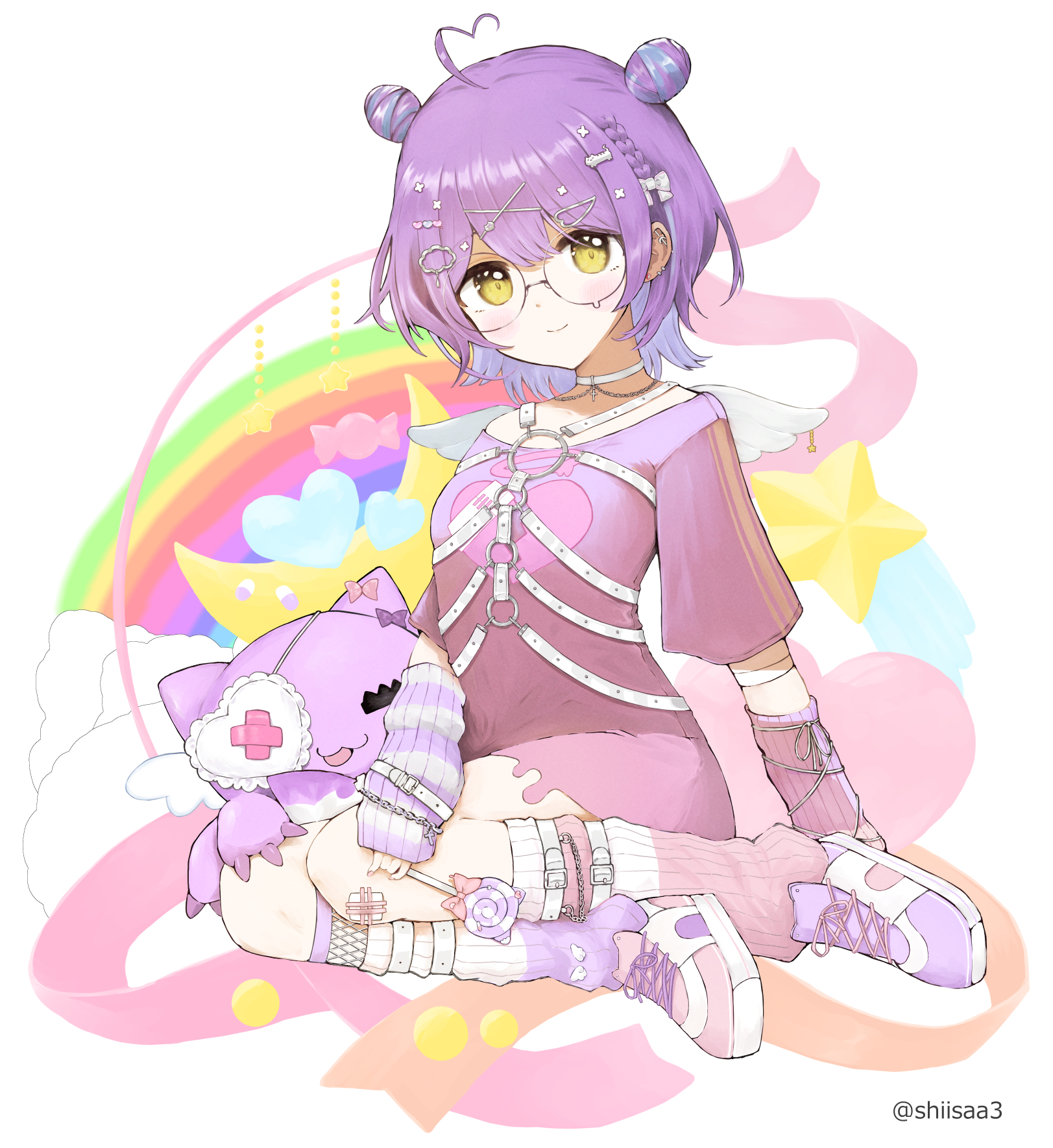 1girl ahoge arm_warmers blush bow braid chest_harness closed_mouth collar commentary_request double_bun full_body gauze_on_knee glasses hair_bow hair_bun hair_ornament hairclip harness heart heart_ahoge highres looking_at_viewer purple_arm_warmers purple_hair purple_shirt shiisaa3 shinomiya_runa shinomiya_runa_(4th_costume) shirt shoes short_sleeves sitting socks solo stuffed_animal stuffed_toy t-shirt twitter_username virtual_youtuber vspo! white_bow white_collar yellow_eyes