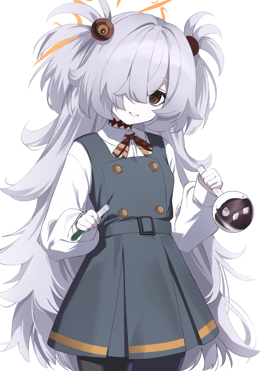1girl black_pantyhose blue_archive breasts brown_eyes choker collared_shirt dress flask grey_dress grin hair_ornament halo highres kanoe_(blue_archive) long_hair long_sleeves looking_at_viewer neck_ribbon neko_daruma pantyhose ribbon round-bottom_flask shirt small_breasts smile solo test_tube two_side_up white_hair white_shirt