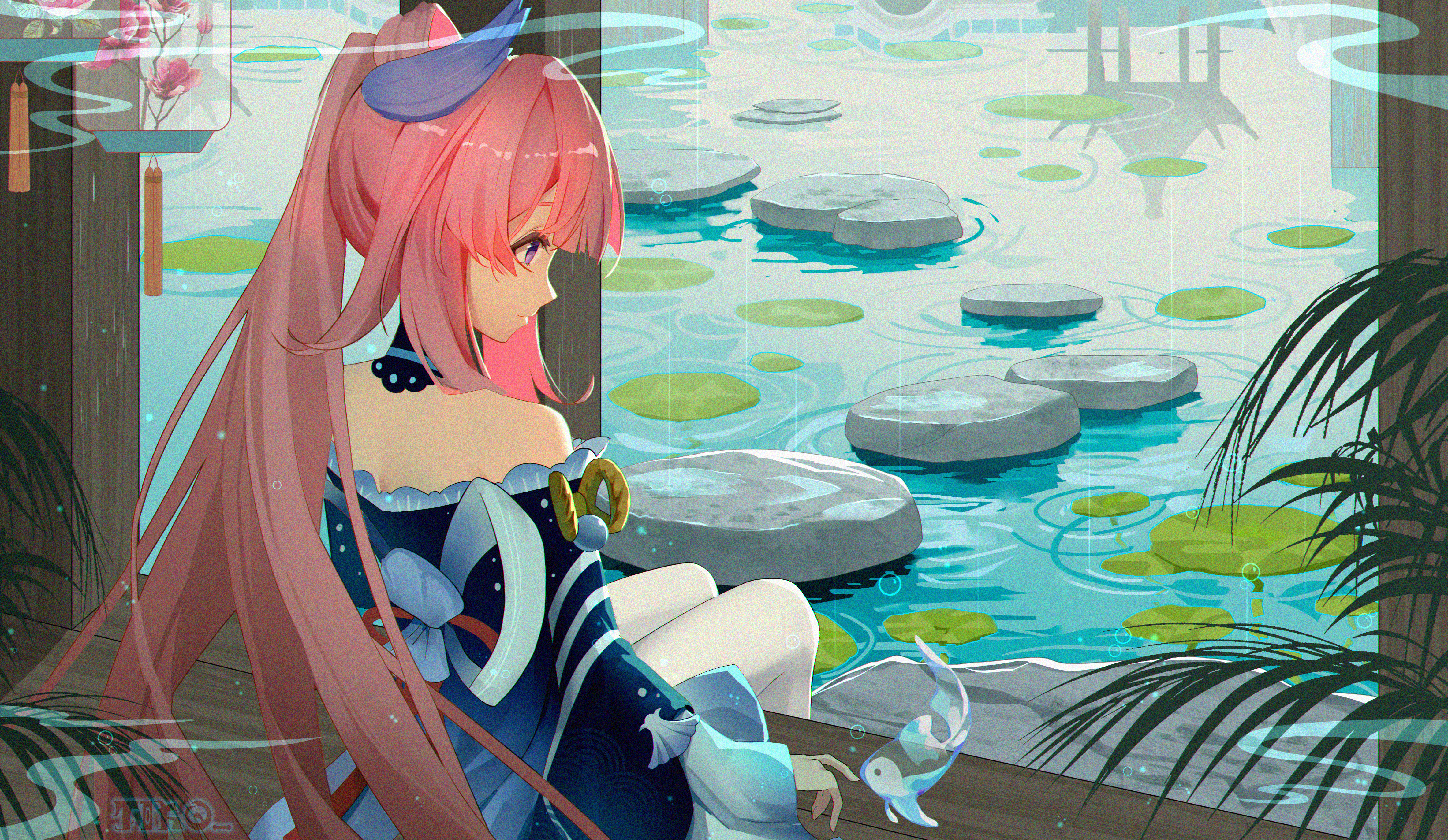 1girl absurdres bare_shoulders blunt_bangs closed_mouth dress fish from_behind genshin_impact hair_ornament highres japanese_clothes long_hair long_sleeves pink_hair rain sangonomiya_kokomi sitting solo strapless strapless_dress tagme thighhighs w-t white_thighhighs