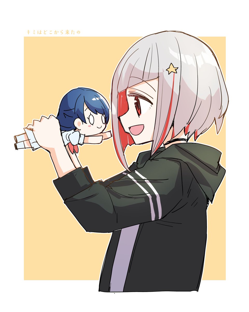 1girl :d black_choker black_jacket blue_dress blue_hair character_doll choker commentary_request diagonal_bangs doll dress from_side grey_hair hair_ornament hasu_no_sora_school_uniform highres hood hood_down hooded_jacket jacket kanduki_kamibukuro link!_like!_love_live! love_live! multicolored_hair murano_sayaka neckerchief nesoberi official_alternate_costume open_clothes open_jacket open_mouth profile puffy_short_sleeves puffy_sleeves red_eyes red_hair red_neckerchief school_uniform shirt short_hair short_sleeves smile solo star_(symbol) star_hair_ornament streaked_hair summer_uniform three-quarter_sleeves translation_request virtual_youtuber white_shirt yugiri_tsuzuri yugiri_tsuzuri_(summer_loungewear)