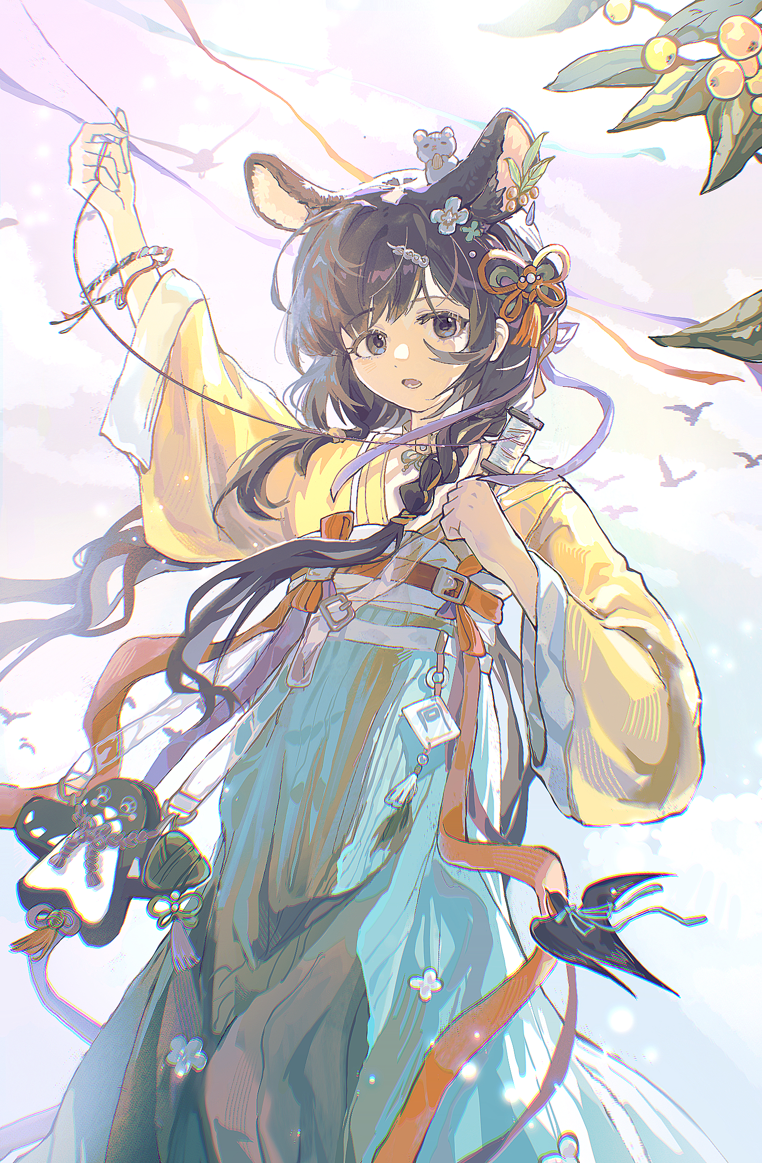 1girl animal_ears arknights black_eyes black_hair blue_skirt chinese_commentary commentary_request hair_ornament hairclip high-waist_skirt highres holding japanese_clothes kimono long_hair long_skirt long_sleeves looking_at_viewer lutonada_(arknights) lutonada_(whispered_longing)_(arknights) mouse_ears mouse_girl official_alternate_costume open_mouth skirt solo standing tassel tassel_hair_ornament wide_sleeves xianyunguhe yellow_kimono