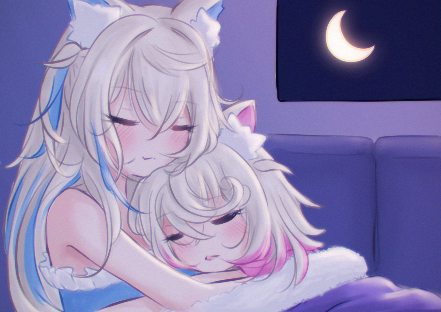 2girls animal_ear_fluff animal_ears bed blanket blonde_hair blush closed_eyes closed_mouth commentary crescent_moon dated_commentary dog_ears dog_girl frills fuwawa_abyssgard hololive hololive_english hug indoors mococo_abyssgard moon multicolored_hair multiple_girls night nightgown open_mouth siblings sisters sleeping smile streaked_hair twins under_covers upper_body virtual_youtuber window yurimiyanae