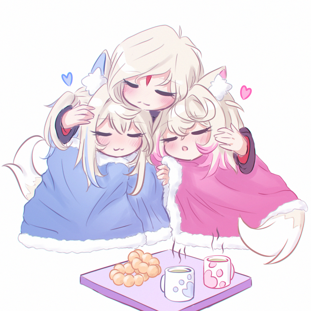 3girls :3 animal_ear_fluff animal_ears blanket blonde_hair blush chestnut_mouth closed_mouth commentary dated_commentary dog_ears dog_girl dog_tail donut english_commentary family food fur_trim fuwawa_abyssgard heart hololive hololive_english hug mama_puppy_(fuwamoco) mococo_abyssgard mother_and_child mother_and_daughter multicolored_hair multiple_girls open_mouth parent_and_child paw_print pon_de_ring short_twintails siblings sisters sleeping steam streaked_hair table tail tea twins twintails under_covers virtual_youtuber white_background yurimiyanae