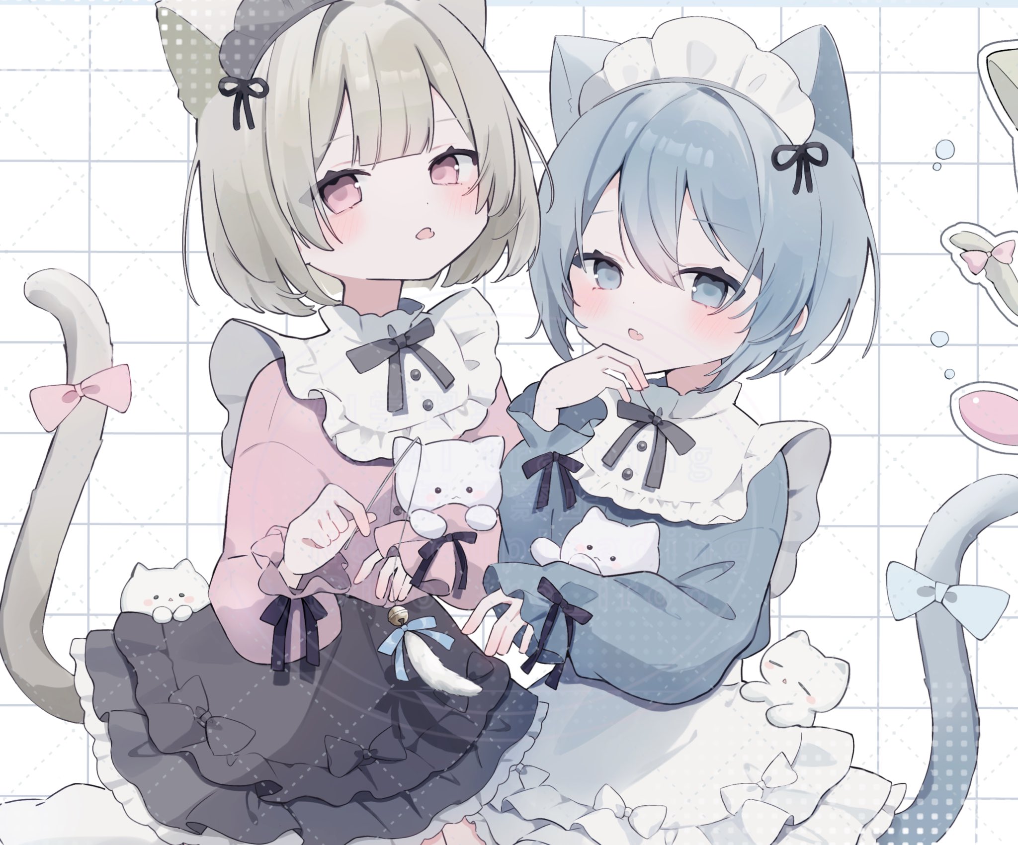2girls animal_ears apron black_ribbon black_skirt blue_eyes blue_hair blue_shirt blush bow cat cat_ears cat_girl cat_tail commission fang frilled_skirt frills grey_hair highres iro_iro_iroo layered_skirt long_sleeves looking_at_viewer maid maid_headdress multiple_girls open_mouth original pink_eyes pink_shirt ribbon shirt short_hair skeb_commission skirt tail tail_bow tail_ornament unconventional_maid white_apron white_cat white_skirt
