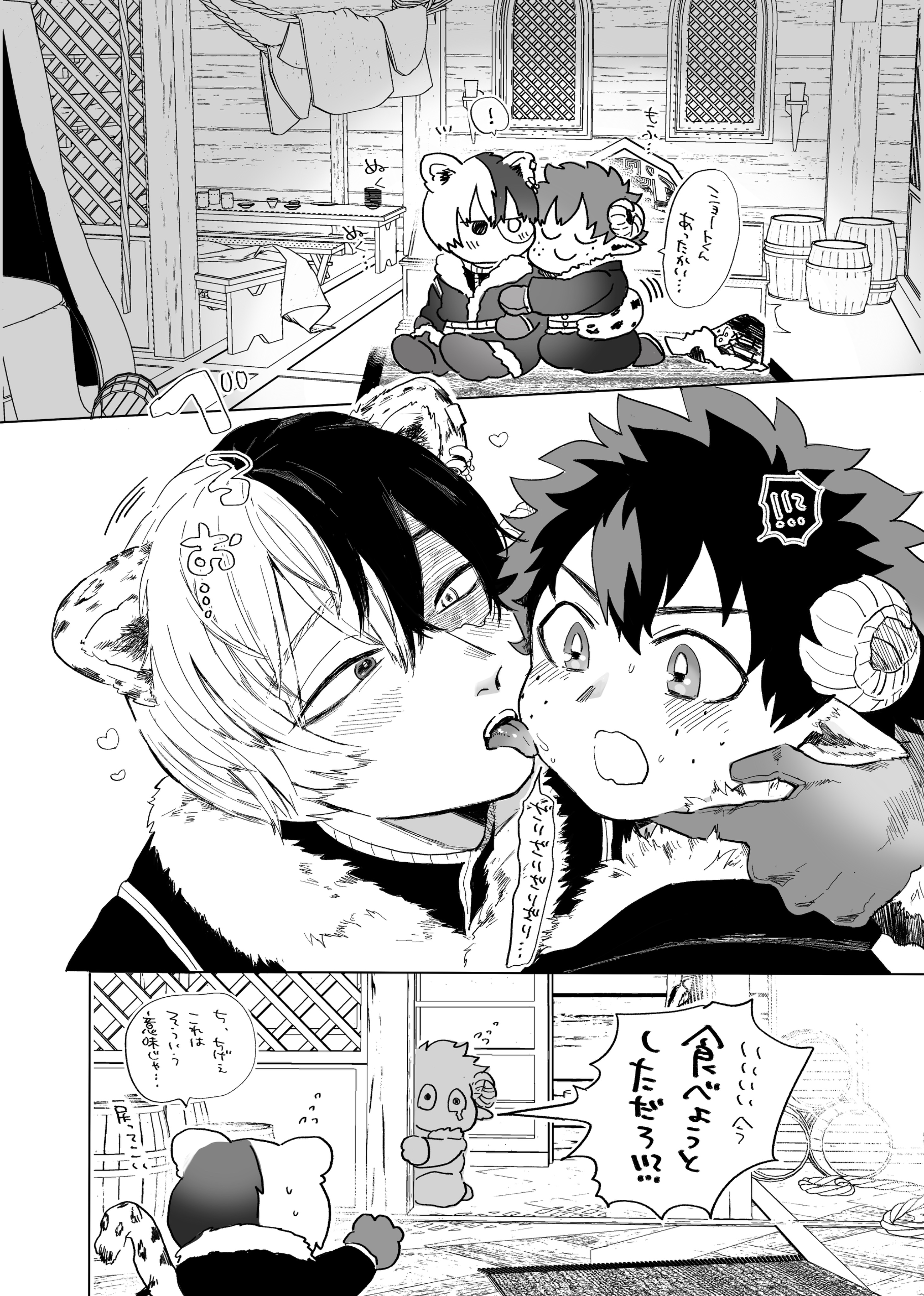 absurdres animal_ears blush boku_no_hero_academia cat cat_ears cat_tail coat freckles highres horns hug indoors licking midoriya_izuku nervous scared sheep sheep_horns smule sushi39222 tail tears tododeku todoroki_shoto yaoi