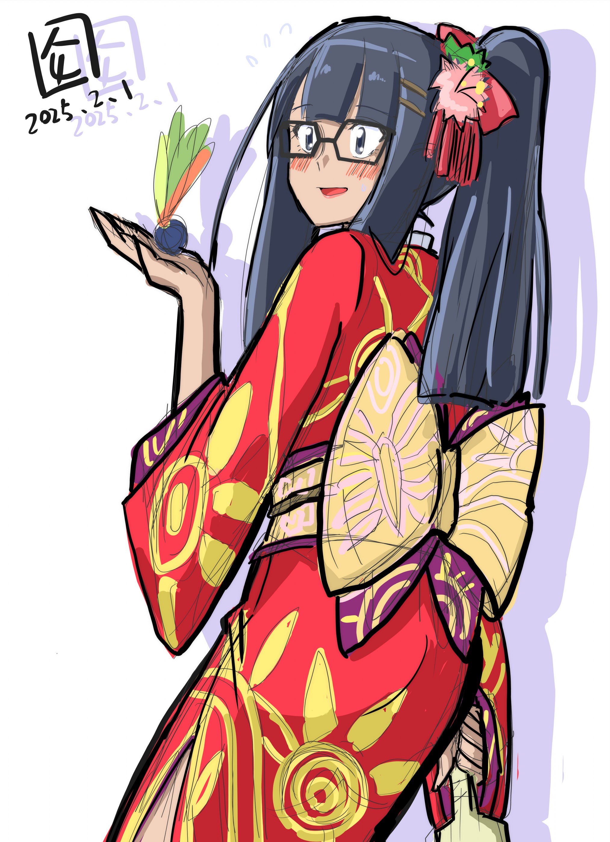 absurdres black_eyes black_hair blush digimon glasses highres japanese_clothes kimono long_hair mochizuki_meiko pixiv_user_(2793991) ribbon