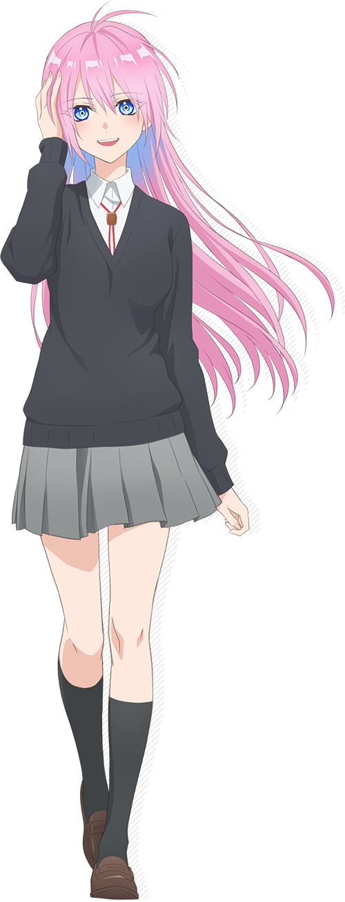1girl ahoge anime_coloring black_socks blue_eyes blush breasts brown_shoes cardigan collared_shirt full_body grey_cardigan grey_skirt hair_between_eyes hand_in_own_hair hand_up highres kawaii_dake_ja_nai_shikimori-san kikuchi_ai large_breasts loafers long_hair long_sleeves looking_at_viewer official_art open_mouth pink_hair pleated_skirt school_uniform shikimori_miyako shirt shoes simple_background skirt smile socks solo standing tachi-e teeth white_background white_shirt