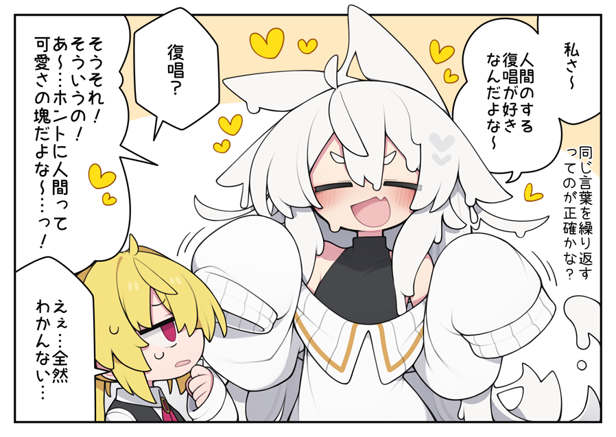 2girls ahoge animal_ears black_shirt blonde_hair closed_eyes collared_shirt commentary_request dorodra_(kisaragi_kaya) fang flipped_hair hair_between_eyes hair_flaps kisaragi_kaya long_hair long_sleeves motion_lines multiple_girls off-shoulder_sweater off_shoulder open_mouth original otogi_hime_(kisaragi_kaya) pink_eyes shirt sidelocks skin_fang sleeveless sleeveless_shirt sleeves_past_fingers sleeves_past_wrists smile speech_bubble sweater translation_request turtleneck turtleneck_shirt very_long_hair white_hair white_shirt white_sweater
