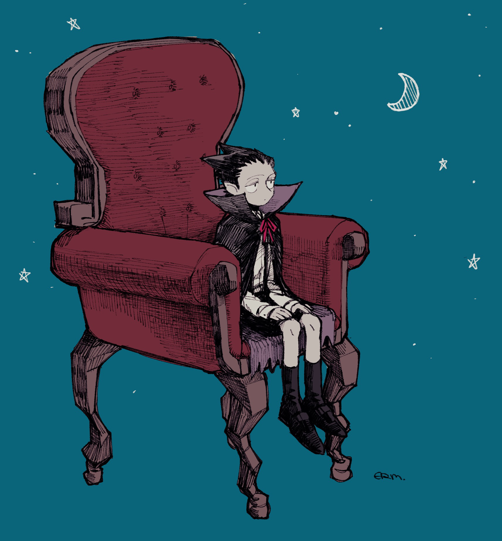 1boy aged_down armchair black_hair black_shoes black_shorts black_socks blue_background chair colored_skin draluc_(kyuuketsuki_sugu_shinu) erm_nkcn expressionless full_body grey_skin high_collar highres kyuuketsuki_sugu_shinu male_focus on_chair red_ribbon ribbon shoes short_hair shorts signature sitting socks solo vampire