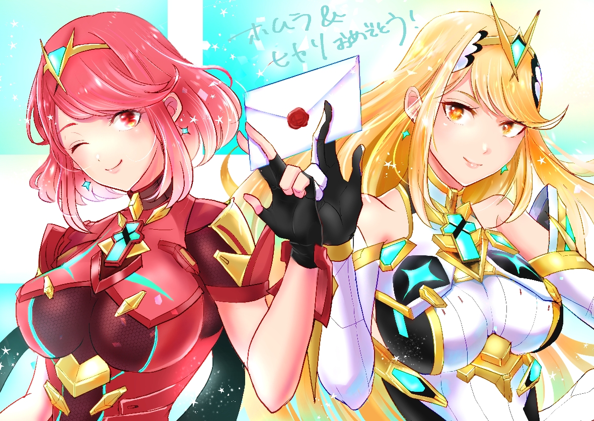 2girls bare_shoulders blonde_hair bob_cut breasts chest_jewel core_crystal_(xenoblade) dress earrings elbow_gloves fingerless_gloves floating_earrings gloves hand_up impossible_clothes jewelry large_breasts long_hair microdress multiple_girls mythra_(massive_melee)_(xenoblade) mythra_(xenoblade) neon_trim nintendo one_eye_closed pyra_(xenoblade) red_eyes red_hair short_hair smash_invitation smile super_smash_bros. swept_bangs tiara umeumeboshino upper_body very_long_hair white_dress xenoblade_chronicles_(series) xenoblade_chronicles_2 yellow_eyes