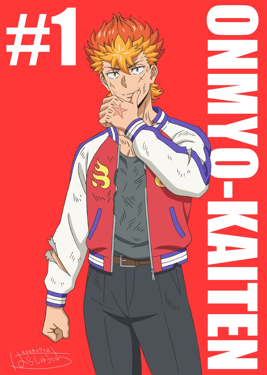 1boy belt brown_eyes clenched_hand copyright_name dated grey_pants grey_shirt hand_tattoo hand_up harasyu1 highres jacket male_focus multicolored_hair narihira_takeru onmyo_kaiten_re:birth orange_hair pants red_background red_hair scar shirt short_hair simple_background spiked_hair standing star_(symbol) star_tattoo tattoo thumb_to_mouth torn_clothes torn_jacket torn_sleeves two-tone_hair