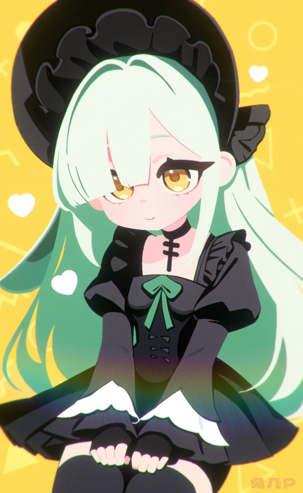 1girl animal_ears bang_dream! bang_dream!_it's_mygo!!!!! black_bonnet black_dress black_gloves black_thighhighs blunt_bangs bonnet closed_mouth cowboy_shot dress floppy_ears gloves gothic_lolita green_hair hair_over_one_eye heart highres lolita_fashion long_hair long_sleeves looking_at_viewer no_lineart rabbit_ears rabbit_girl sidelocks sitting smile solo thighhighs tuji_p wakaba_mutsumi wakaba_mutsumi_(marionette's_id) yellow_background yellow_eyes