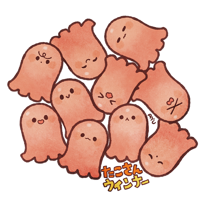>:p >_< :3 :d artist_name ayu_(mog) black_eyes blush_stickers closed_eyes closed_mouth food food_art furrowed_brow hot_dog multiple_others open_mouth original simple_background smile tako-san_wiener tentacles translated wavy_mouth white_background xd