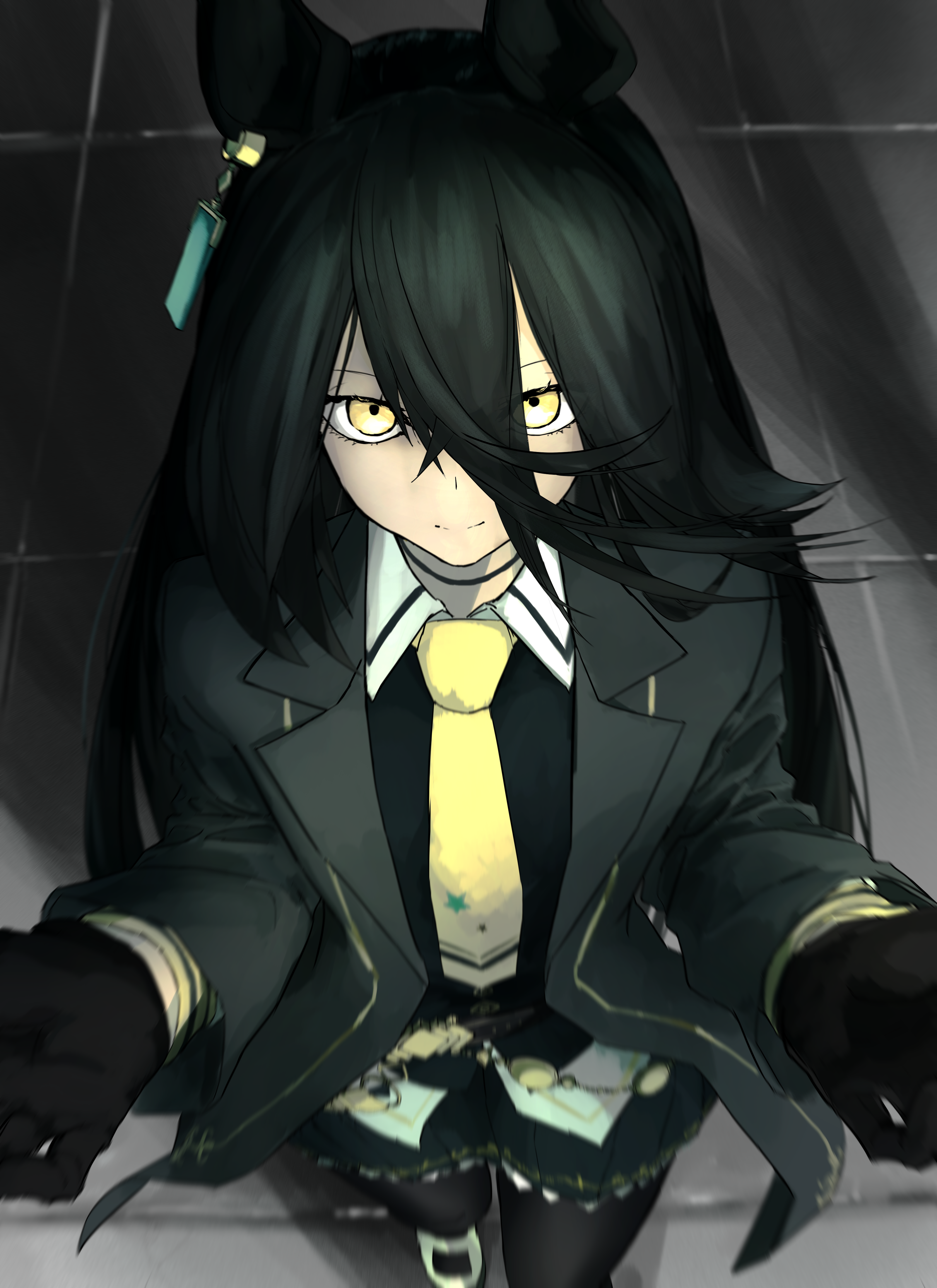 1girl absurdres animal_ears black_choker black_gloves black_hair black_pantyhose black_skirt black_vest choker closed_mouth collared_shirt cowboy_shot ear_ornament ear_tag earrings fujigaya_seizo gloves hair_between_eyes hands_up hem_peeking_out highres horse_ears horse_girl jewelry long_bangs long_hair long_hair_between_eyes long_sleeves manhattan_cafe_(umamusume) pantyhose pleated_skirt shirt shoes single_earring skirt smile solo umamusume variant_set very_long_hair vest white_shirt white_shoes yellow_eyes