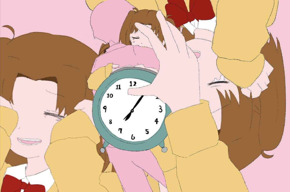 00_myoo 1boy 1girl alarm_clock bow brown_hair clock closed_eyes collared_shirt crying forced_smile hug kyu-kurarin_(cevio) long_hair long_sleeves multiple_girls open_mouth pink_background red_bow school_uniform shirt short_hair sleeves_past_wrists smile sweater tears tohno_shiki tsukihime two_side_up white_shirt wiping_tears yellow_sweater yumizuka_satsuki