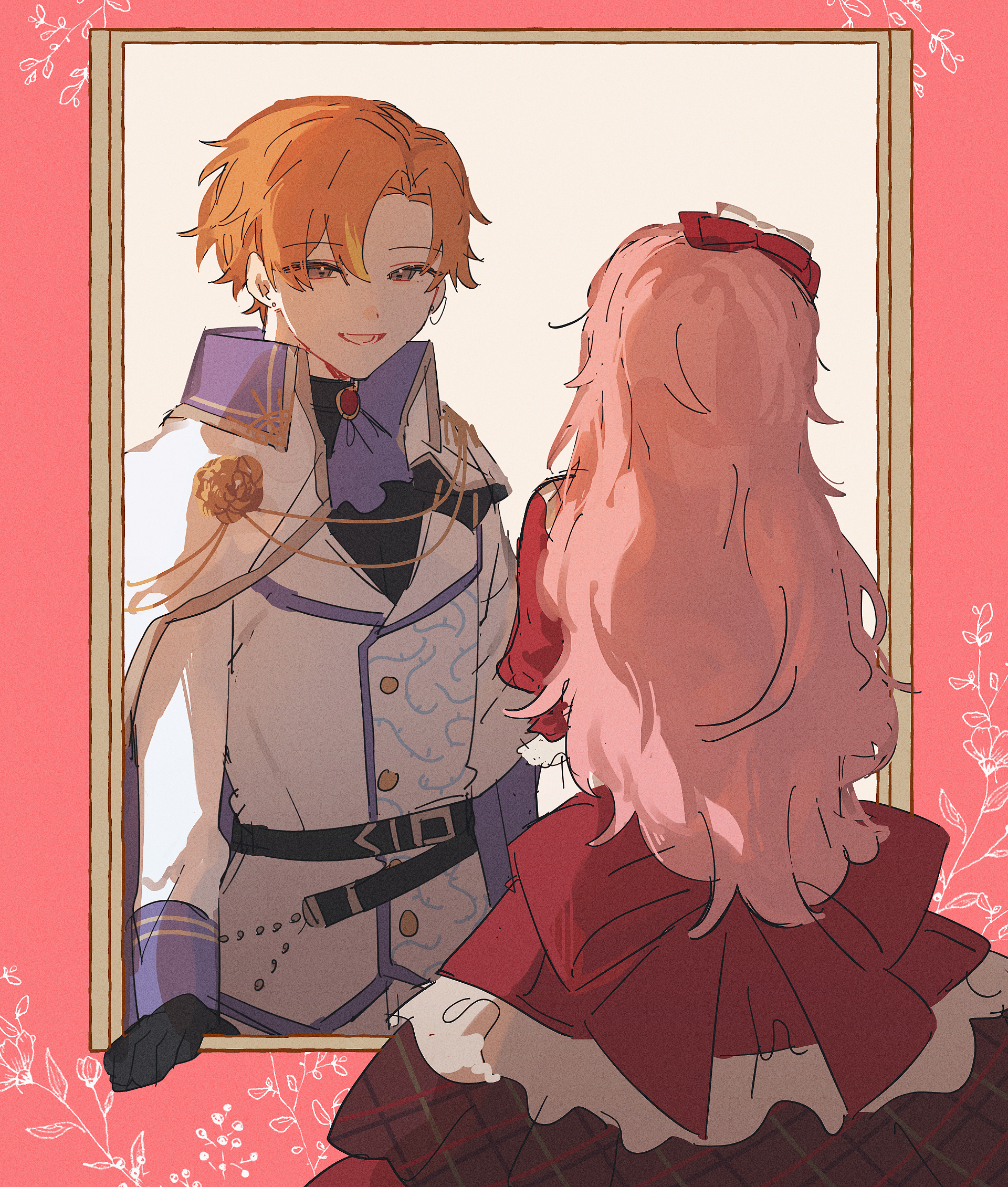 1boy 1girl black_gloves dress earrings gloves highres himitsu_no_valentine_daisakusen!_(project_sekai) jewelry kaitou_shinshi_no_harahara!?_white_day_(project_sekai) keeta long_hair long_sleeves momoi_airi multicolored_hair official_alternate_costume official_alternate_hairstyle orange_hair pink_hair project_sekai ribbon shinonome_akito shirt smile streaked_hair