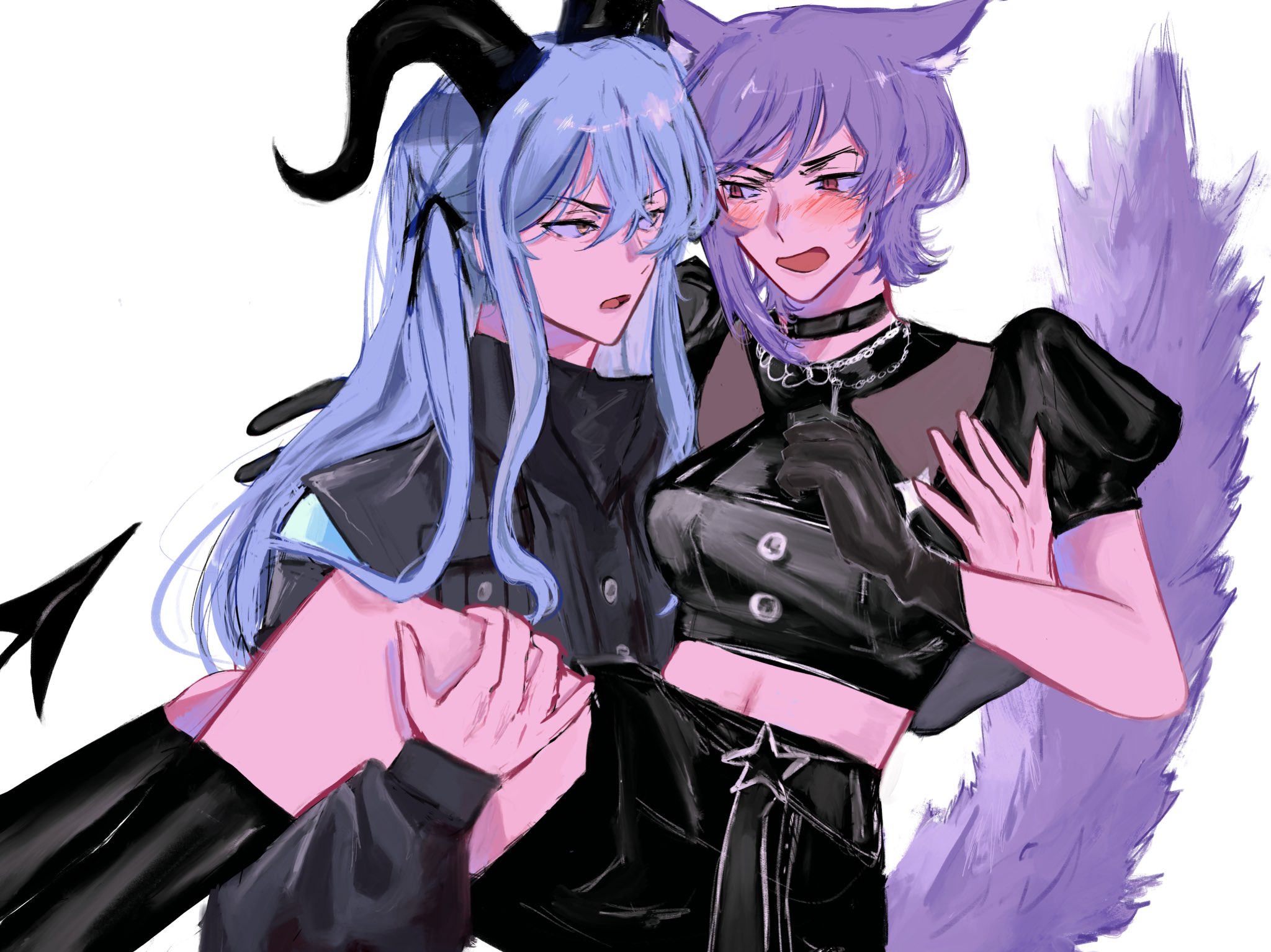 2girls animal_ears arknights bang_dream! bang_dream!_it's_mygo!!!!! black_boots black_choker black_gloves black_skirt blush boots carrying cat_ears cat_girl cat_tail choker commentary crop_top embarrassed english_commentary gloves grey_jacket hair_between_eyes highres horns hyutena jacket long_sleeves multiple_girls navel open_mouth princess_carry puffy_short_sleeves puffy_sleeves purple_hair short_hair short_sleeves skirt tail togawa_sakiko togawa_sakiko_(master_of_melodia) yellow_eyes yuutenji_nyamu yuutenji_nyamu_(feline) yuutenji_nyamu_(magician_of_passion)