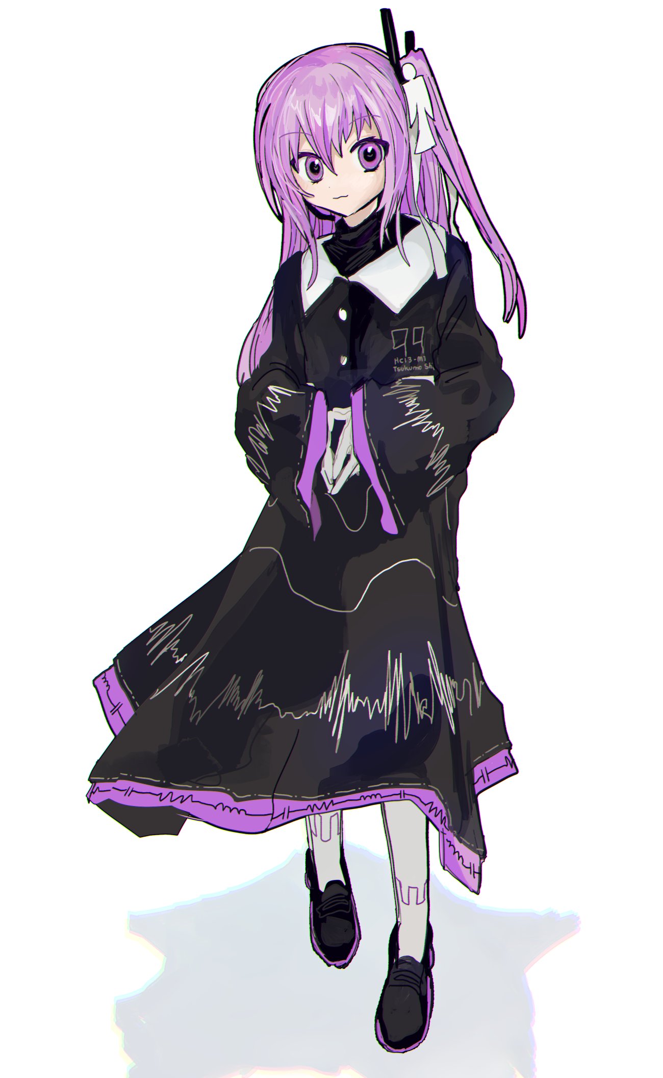 1girl black_dress black_shirt black_shoes closed_mouth dress full_body gloves hair_ornament hair_ribbon highres long_hair long_sleeves looking_at_viewer one_side_up own_hands_together pantyhose purple_eyes purple_hair ribbon sanotsuki_(mochi0101_831) shirt shoes simple_background solo tsukumo_shion utau white_background white_gloves white_pantyhose
