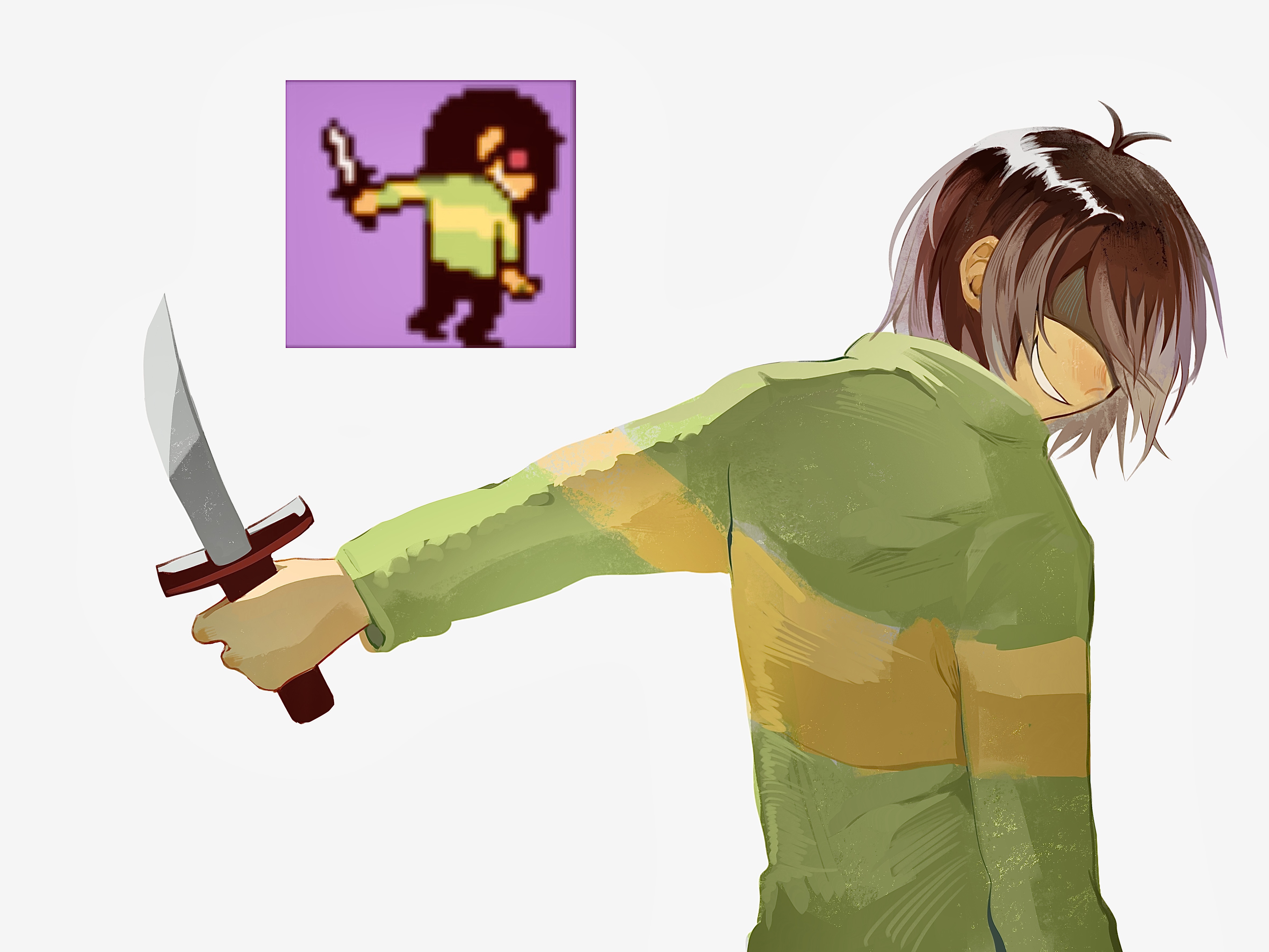1other absurdres brown_hair chinese_commentary colored_skin commentary_request deltarune facing_back from_behind green_shirt highres holding holding_knife knife kris_(deltarune) long_sleeves meki_(miki512746) other_focus outstretched_arm reference_inset shirt short_hair single_horizontal_stripe smile striped_clothes striped_shirt utdr_(toby_fox) yellow_skin