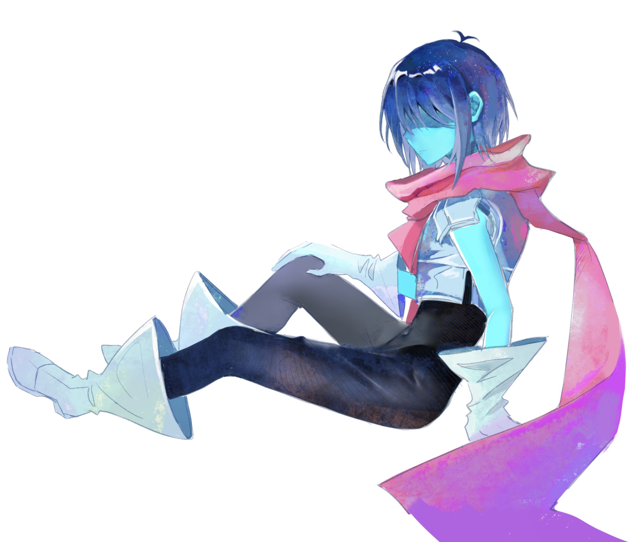 1other armor armored_boots black_bodysuit blue_hair blue_skin bodysuit boots breastplate colored_skin commentary covered_navel deltarune from_side full_body gloves highres kris_(dark_world)_(deltarune) kris_(deltarune) meki_(miki512746) other_focus partially_shaded_face pink_scarf scarf simple_background sleeveless sleeveless_bodysuit utdr_(toby_fox) white_background