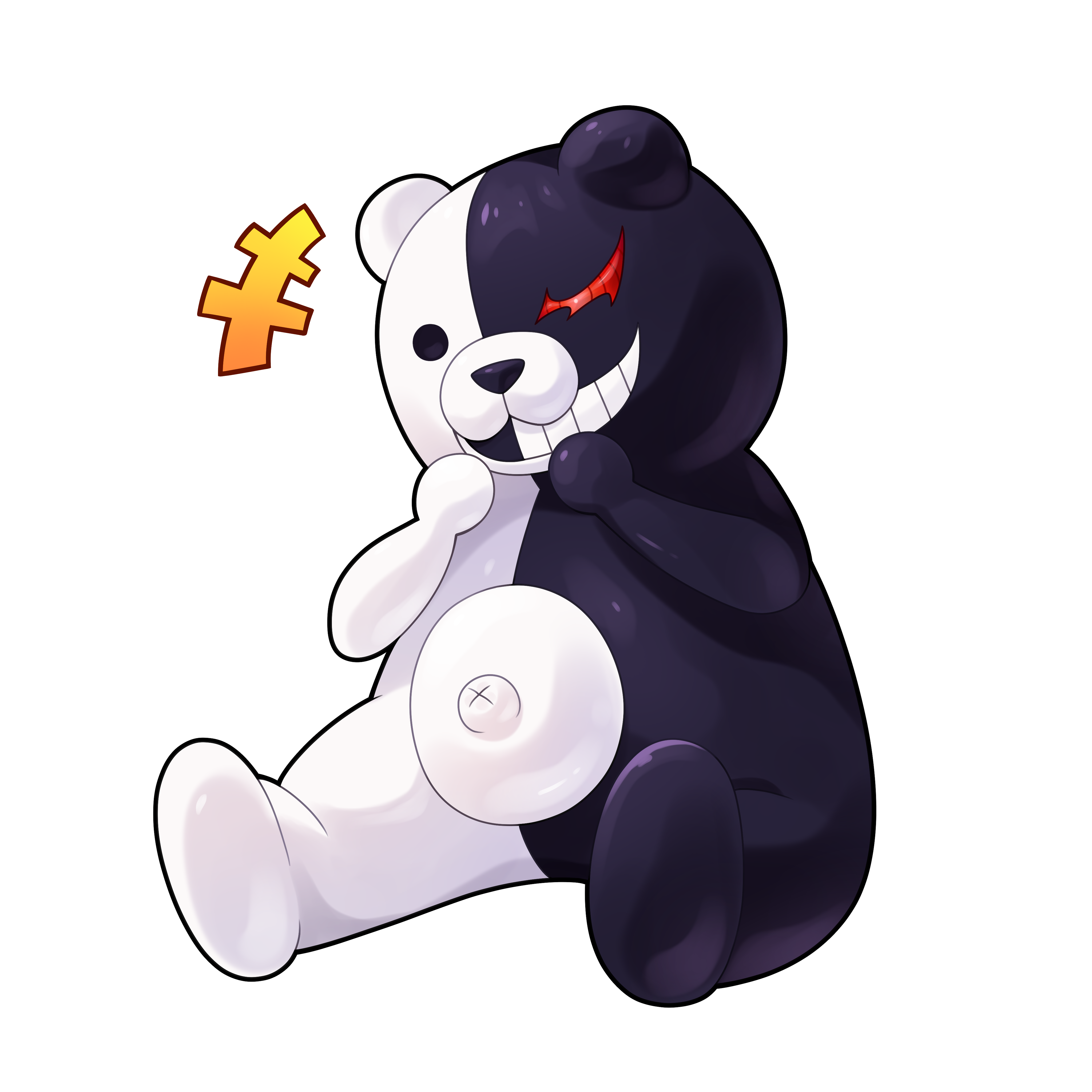 +++ absurdres animal animal_focus bear danganronpa_(series) full_body goom_(goomyparty) grin hands_up highres monokuma outie_navel simple_background sitting smile solo white_background x_navel