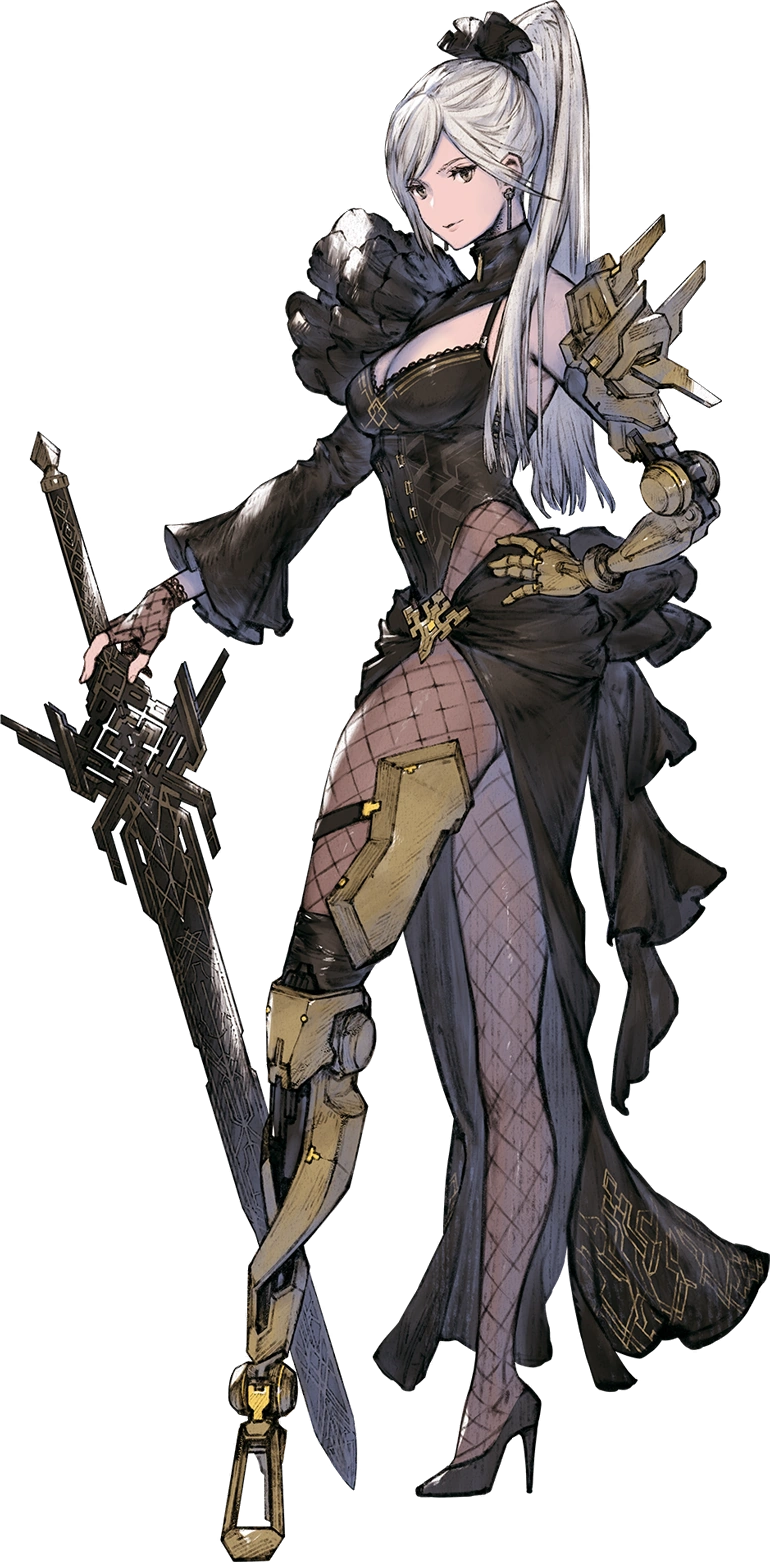 1girl bare_shoulders black_dress breasts dress earrings frenlyse high_heels highres jewelry long_hair looking_at_viewer nier_(series) nier_reincarnation official_art rr_(suisse200) solo standing w weapon