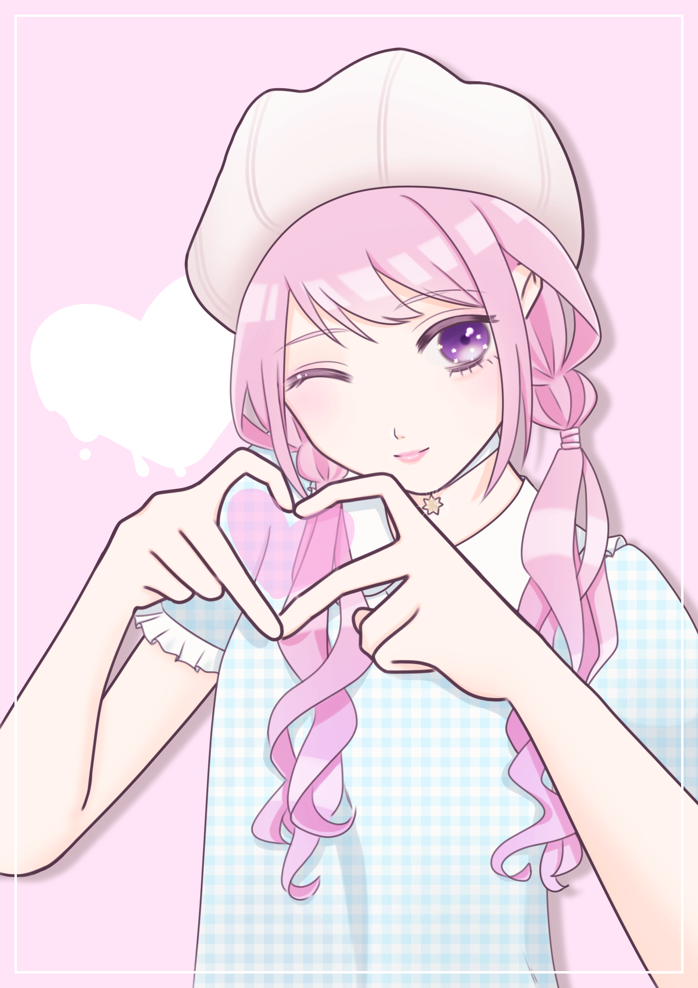 absurdres bare_shoulders beanie blue_choker blue_shirt choker closed_mouth collared_shirt commentary_request dripping eyelashes frilled_sleeves frills hair_over_shoulder hair_tie hat heart heart_hands highres light_blush lipstick long_hair low_twintails makeup nikki_(series) one_eye_closed pink_background pink_hair pink_lips plaid_clothes plaid_shirt puffy_short_sleeves puffy_sleeves purple_eyes shinenk_karen shining_nikki shirt short_sleeves smile star_(symbol) star_choker stylist_(nikki) twintails unmoving_pattern wavy_hair white_hat