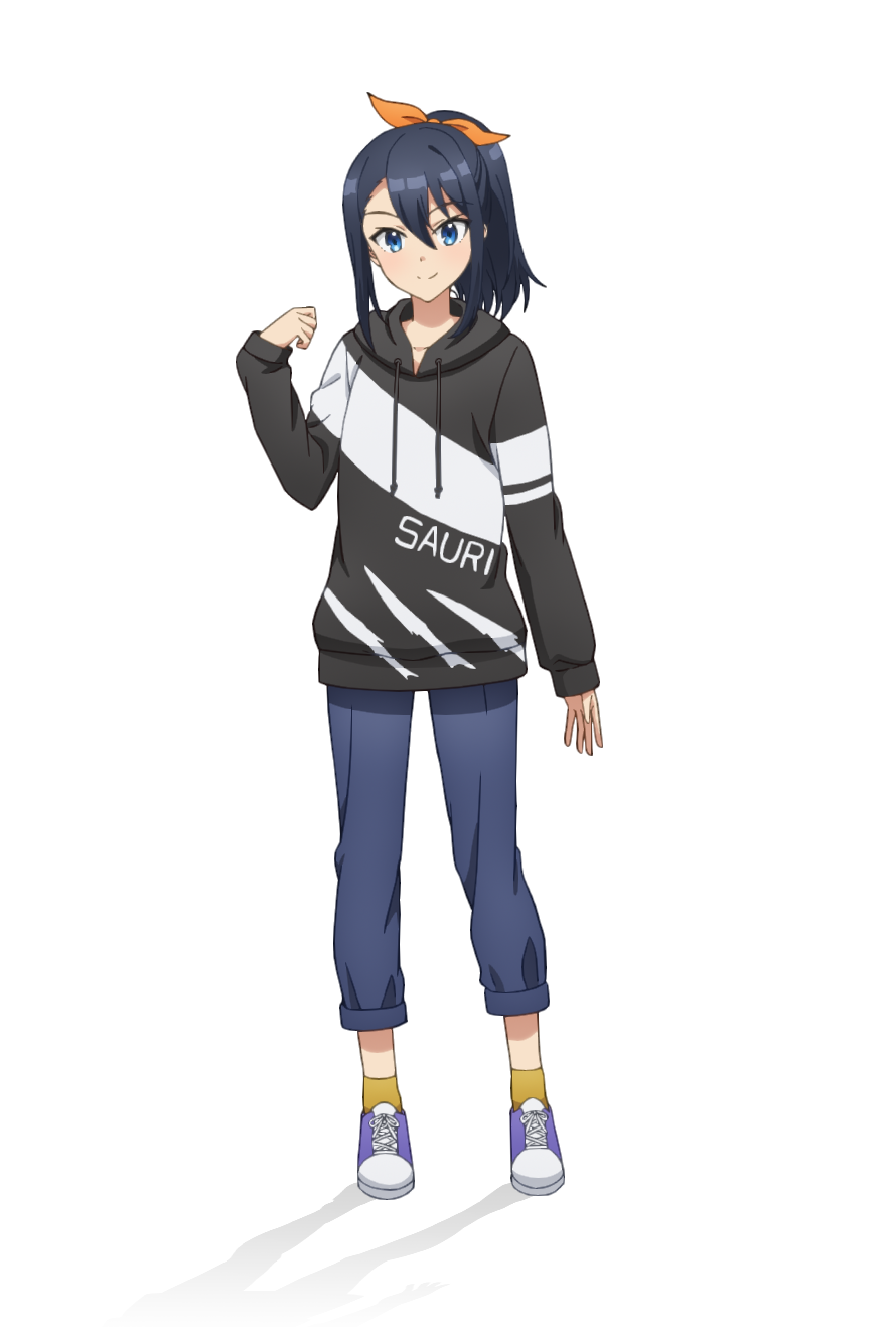 1girl anime_coloring black_hair black_hood black_hoodie blue_eyes blue_pants blush closed_mouth cue! english_text full_body hair_between_eyes hair_ribbon hand_up highres hood hood_down hoodie long_sleeves looking_at_viewer official_art open_hand orange_ribbon pants ponytail purple_shoes ribbon shoes sidelocks simple_background smile socks solo standing striped_clothes striped_hoodie tachi-e takatori_maika taniguchi_motohiro transparent_background two-tone_hoodie yellow_socks