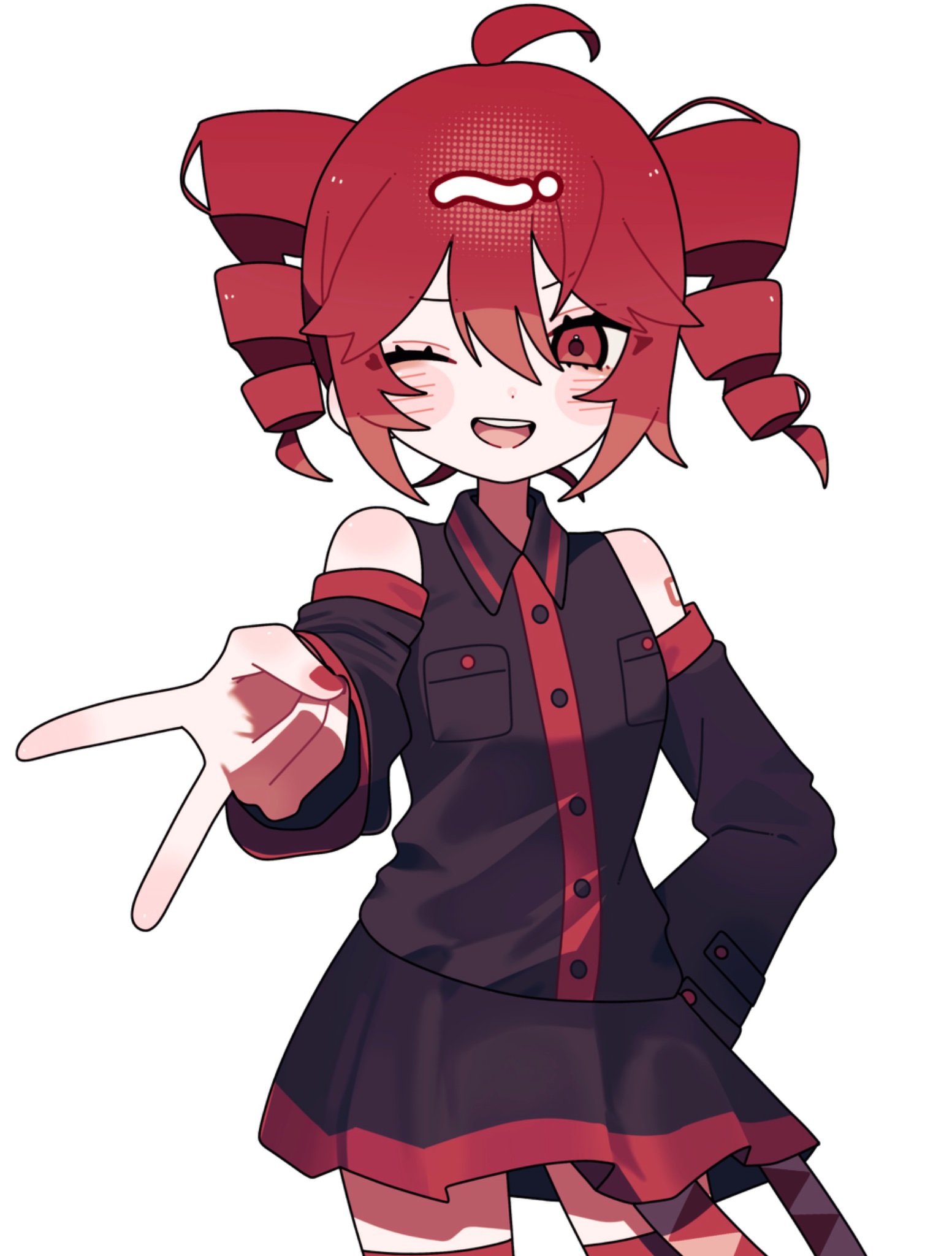 1girl ahoge bare_shoulders black_shirt black_skirt black_sleeves blush_stickers breast_pocket buttons cowboy_shot detached_sleeves drill_hair hair_between_eyes halftone highres kasane_teto kasane_teto_(utau) long_sleeves looking_at_viewer nail_polish number_tattoo okayu_(okayuyuyu2) one_eye_closed open_mouth pocket red_eyes red_hair red_nails shirt simple_background skirt sleeveless sleeveless_shirt smile solo standing tattoo teeth twin_drills upper_teeth_only utau v white_background