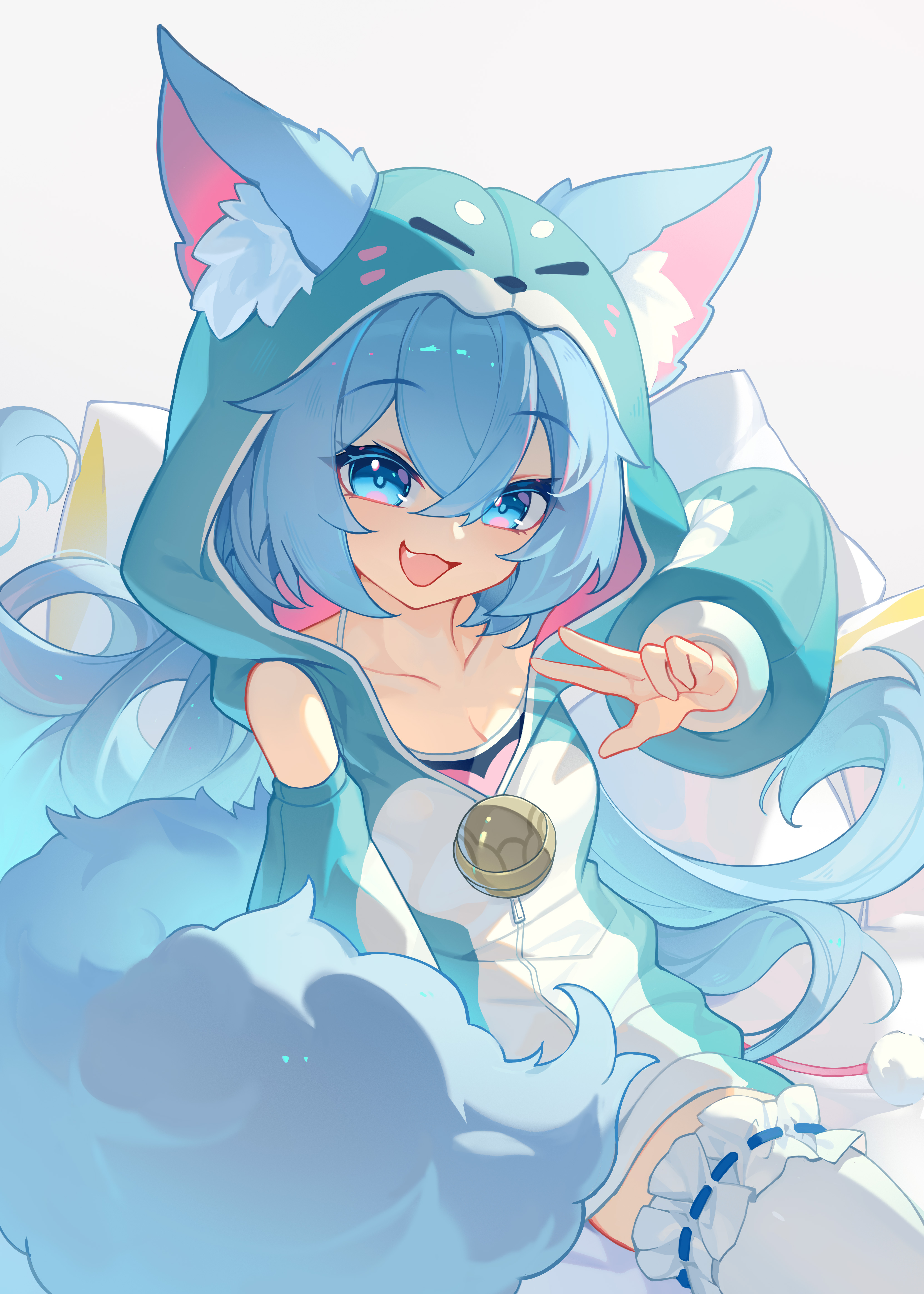1girl :3 :d absurdres animal_ear_fluff animal_ears animal_hood bare_shoulders blue_eyes blue_hair breasts cai_xiao_xi cleavage collarbone detached_sleeves fang fox_ears fox_girl fox_tail hair_between_eyes highres hood hood_up hoodie long_hair long_sleeves looking_at_viewer open_mouth original pillow simple_background smile solo tail two-tone_hoodie v very_long_hair w white_background