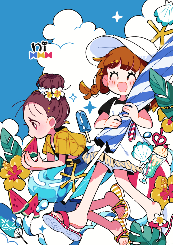2girls :d ^_^ bendy_straw black_shirt blue_shorts blue_sky blue_umbrella blush braid brown_hair closed_eyes cloud commentary cup day dress drinking_glass drinking_straw eating flower food fruit hair_bun hair_flower hair_ornament hat holding holding_food holding_umbrella jacket multiple_girls nagino_nichiko open_clothes open_jacket open_mouth original outdoors pinafore_dress red_eyes sandals shirt short-sleeved_jacket short_hair short_sleeves shorts shorts_under_dress single_hair_bun sky sleeveless sleeveless_dress smile striped_umbrella summer twin_braids umbrella watermelon watermelon_slice white_dress white_flower white_hat white_sandals white_shorts yellow_jacket yellow_sandals