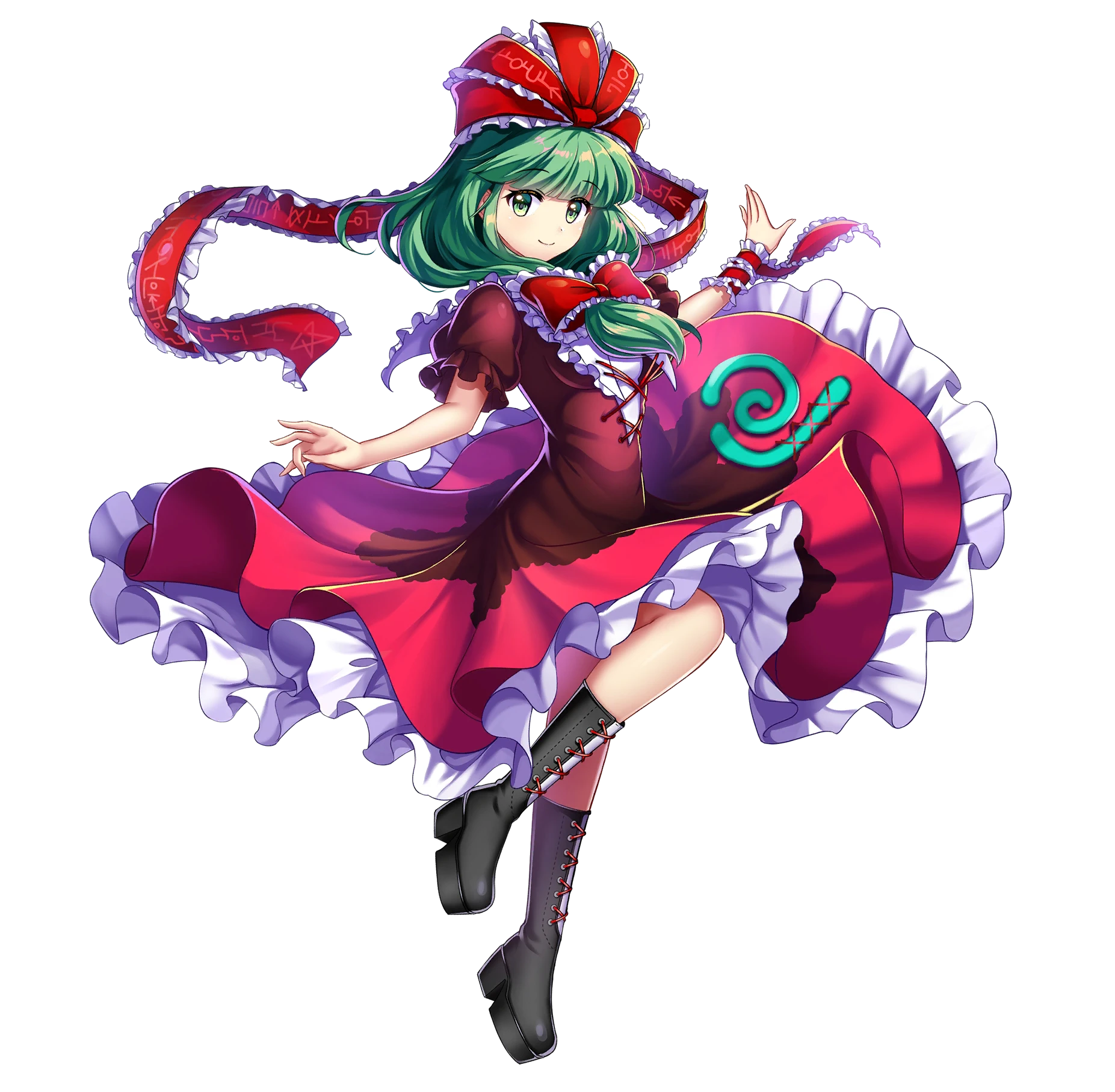 1girl arm_ribbon bad_bilibili_link bad_link black_boots boots cross-laced_clothes dress frilled_skirt frills front_ponytail full_body game_cg green_eyes green_hair hair_ribbon highres kagiyama_hina lace-up_boots long_hair looking_at_viewer official_art red_dress red_ribbon red_shirt ribbon rotte_(1109) shirt short_sleeves simple_background skirt solo third-party_source touhou touhou_lostword white_background