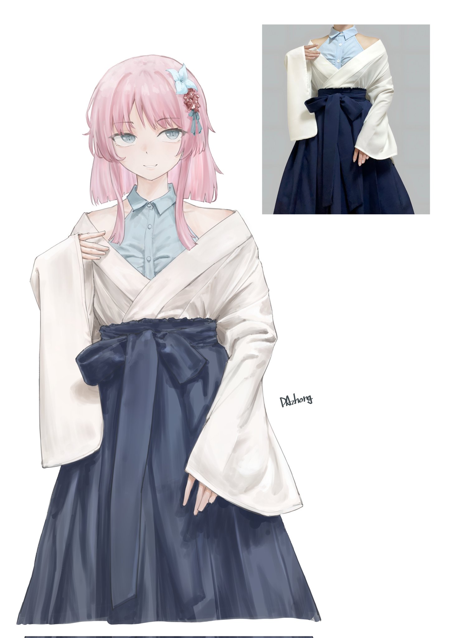 1girl bang_dream! bang_dream!_it's_mygo!!!!! blue_skirt chihaya_anon chinese_commentary commentary_request dazhong_(dazhong02312) flower grey_eyes hair_flower hair_ornament highres long_hair long_skirt off_shoulder pink_hair reference_inset simple_background skirt white_background